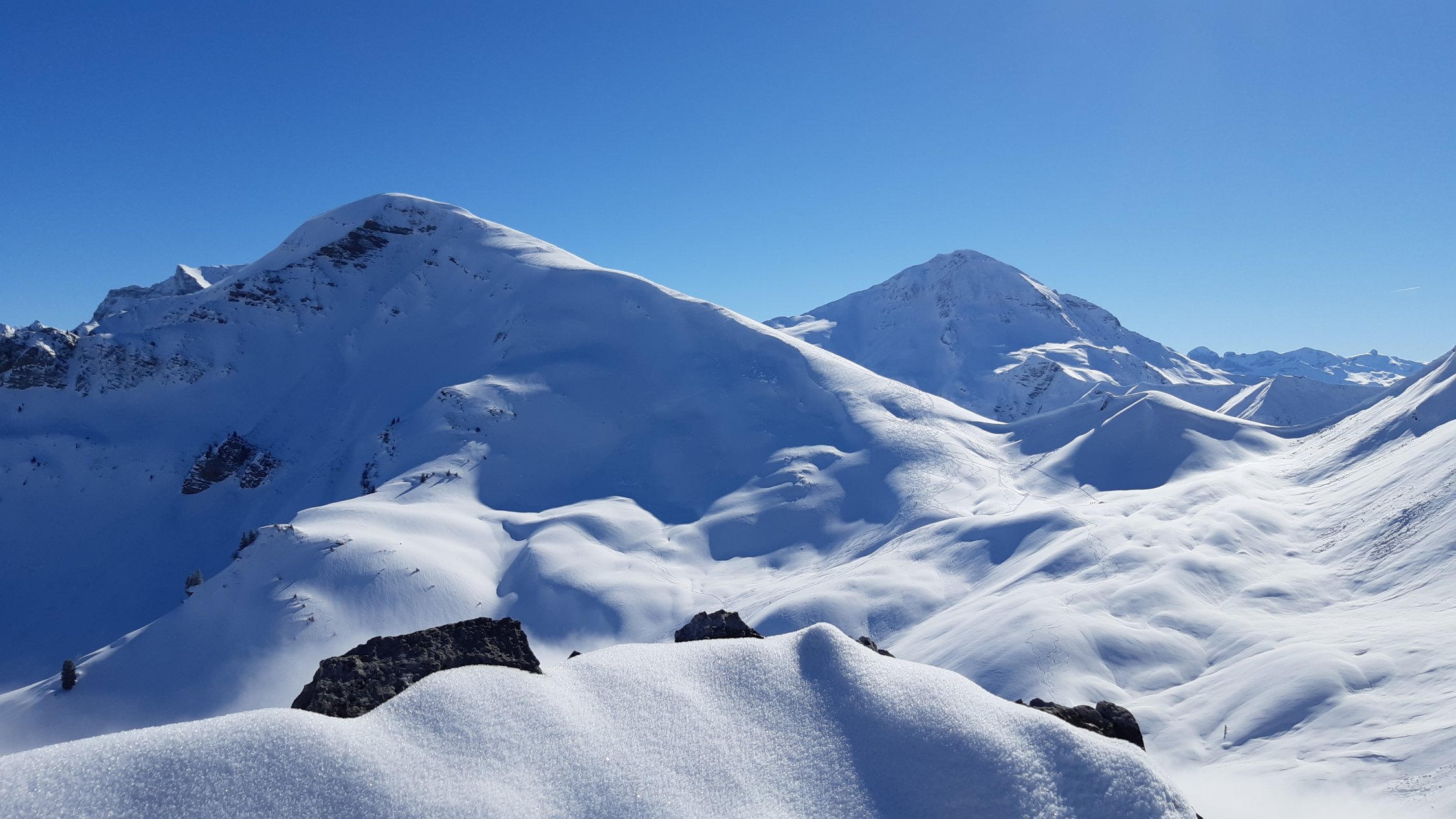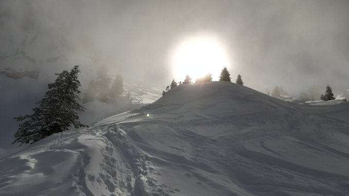 Hochnebel bis ca. 1750, oben sonnig und erstaunlich mild, fast windstill. Schöner Pulver auf harter Unterlage, die alten Spuren stören kaum.