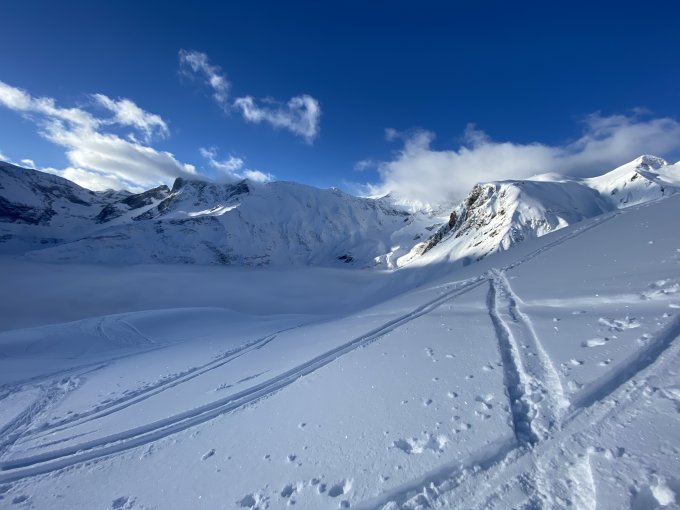 Aufstiegsroute gedeckelt bis ca. 2400m. Abfahrt über Bischofalp, perfekter Pulver.