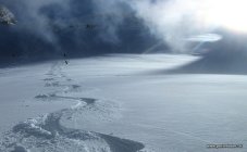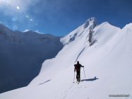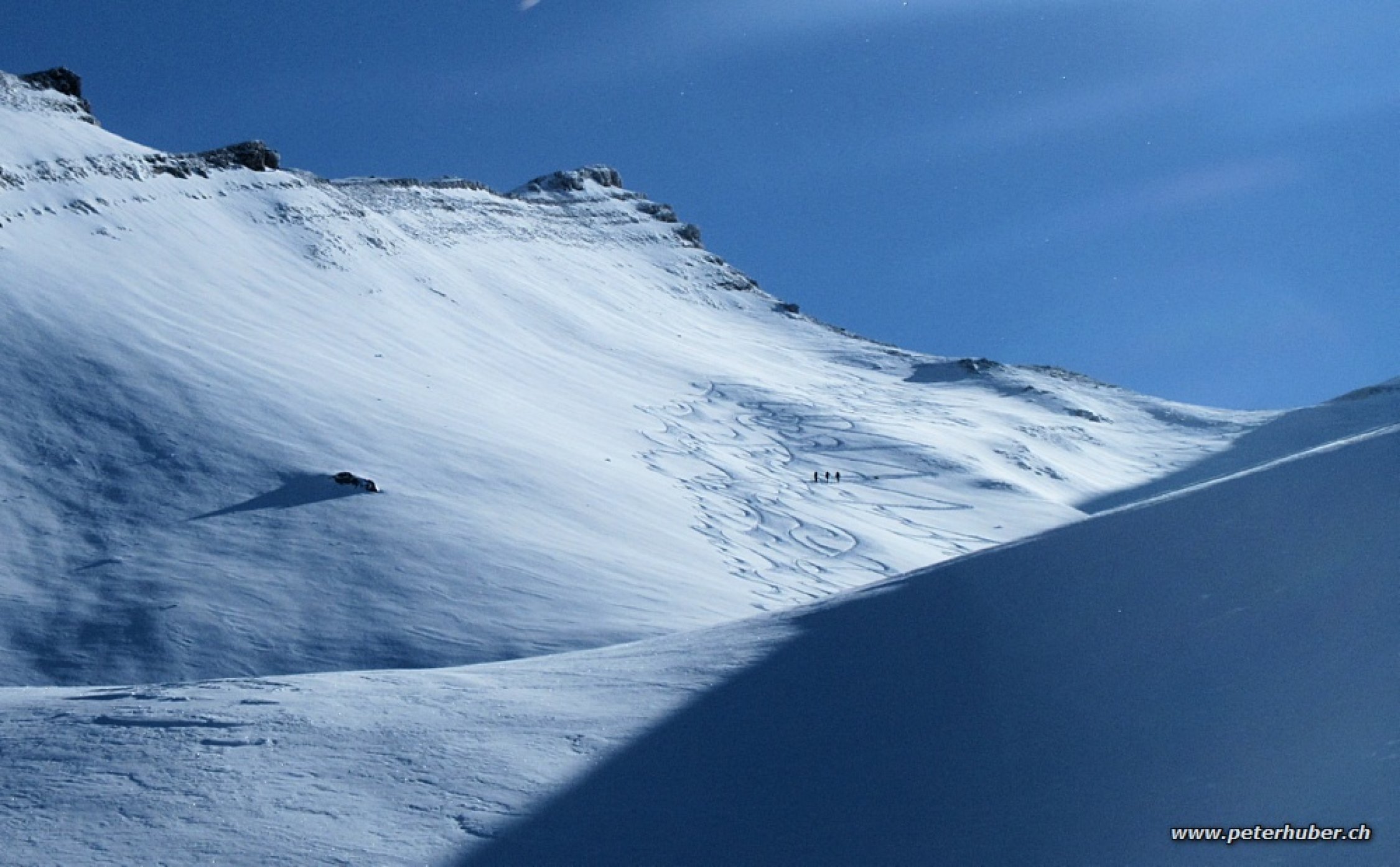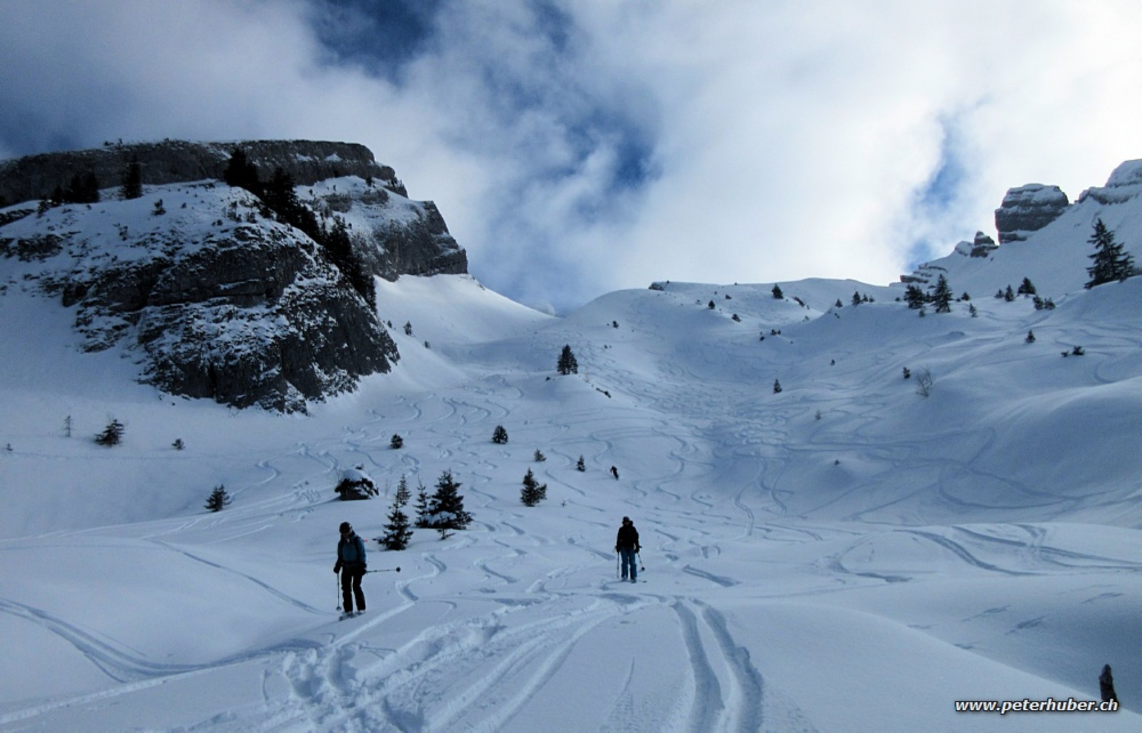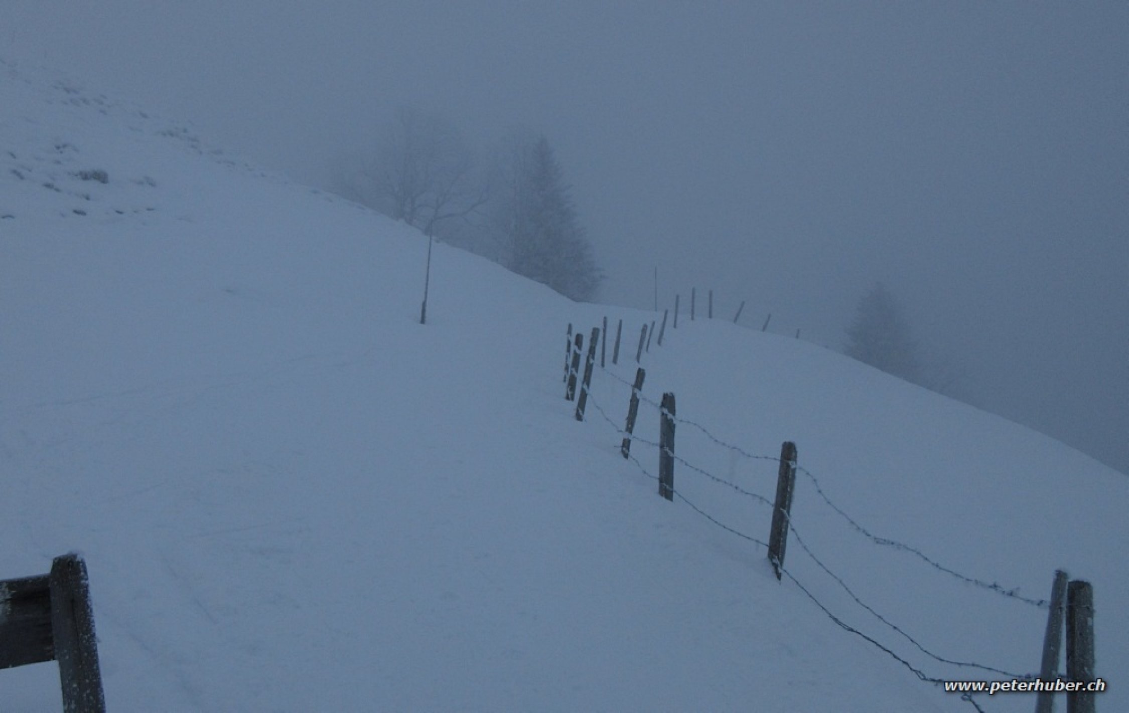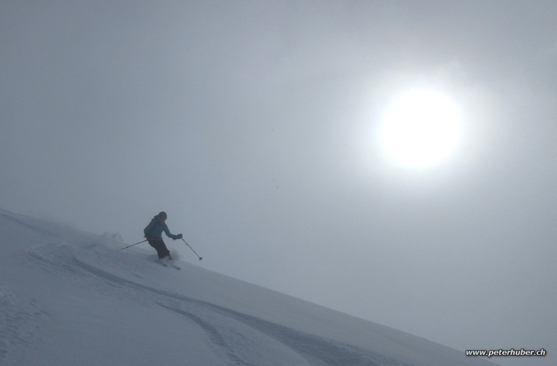 Kalt am Start und Nebel. Am Start liegen ca. 10 cm Neuschnee, fast ohne Unterlage. Weiter oben dann ca. 15 cm luftiger Pulverschnee, der kaum mit der Unterlage verbunden ist. Ab 1800 m kamen wir dann aus dem Hochnebel. Doch er stieg dann fast bis zum Gipfel auf. Zum Glück nicht ganz dicht.