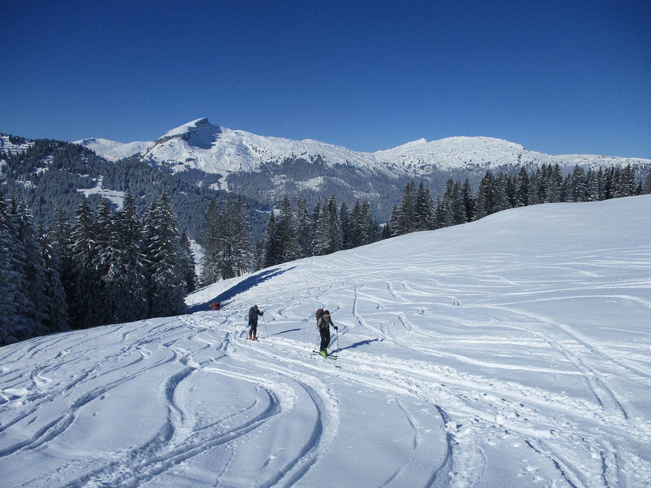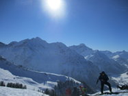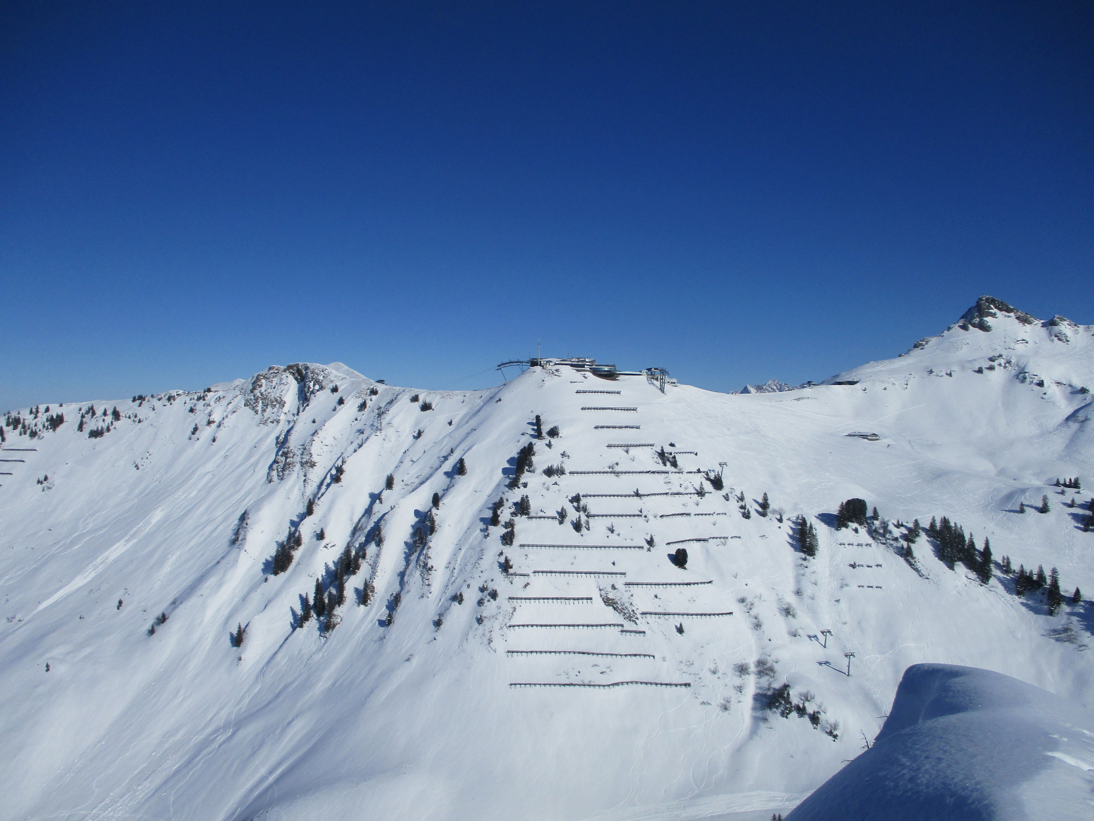 Feinster Pulver in der NW-Flanke der Kuhgehrenspitze. Zwar schon etwas zerfahren, doch fanden sich noch genügend Pulverpads für einen flott-federnden Abstieg. Wir sind von der Bergstation Zwerenalpbahn noch zur Bergstation Kanzelwand aufgestiegen. Dass es sich bei dem felsigen Gipfel rechterhand um den relativ probblemlos besteigbaren Kanzelwandgipfel handelte, war uns in dem Moment nicht gewahr. Immerhin habe ich dem leicht erreichbaren Gundkopf noch einen Besuch abgestattet, bevor es über die zu unserer Überraschung präparierte Piste talwärts ging.