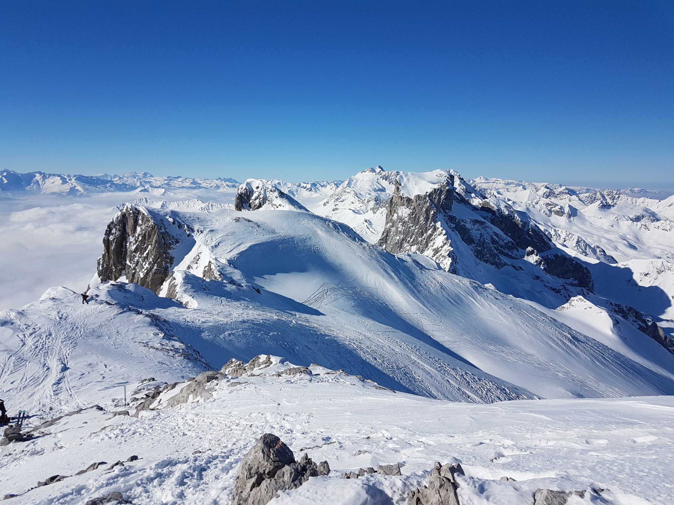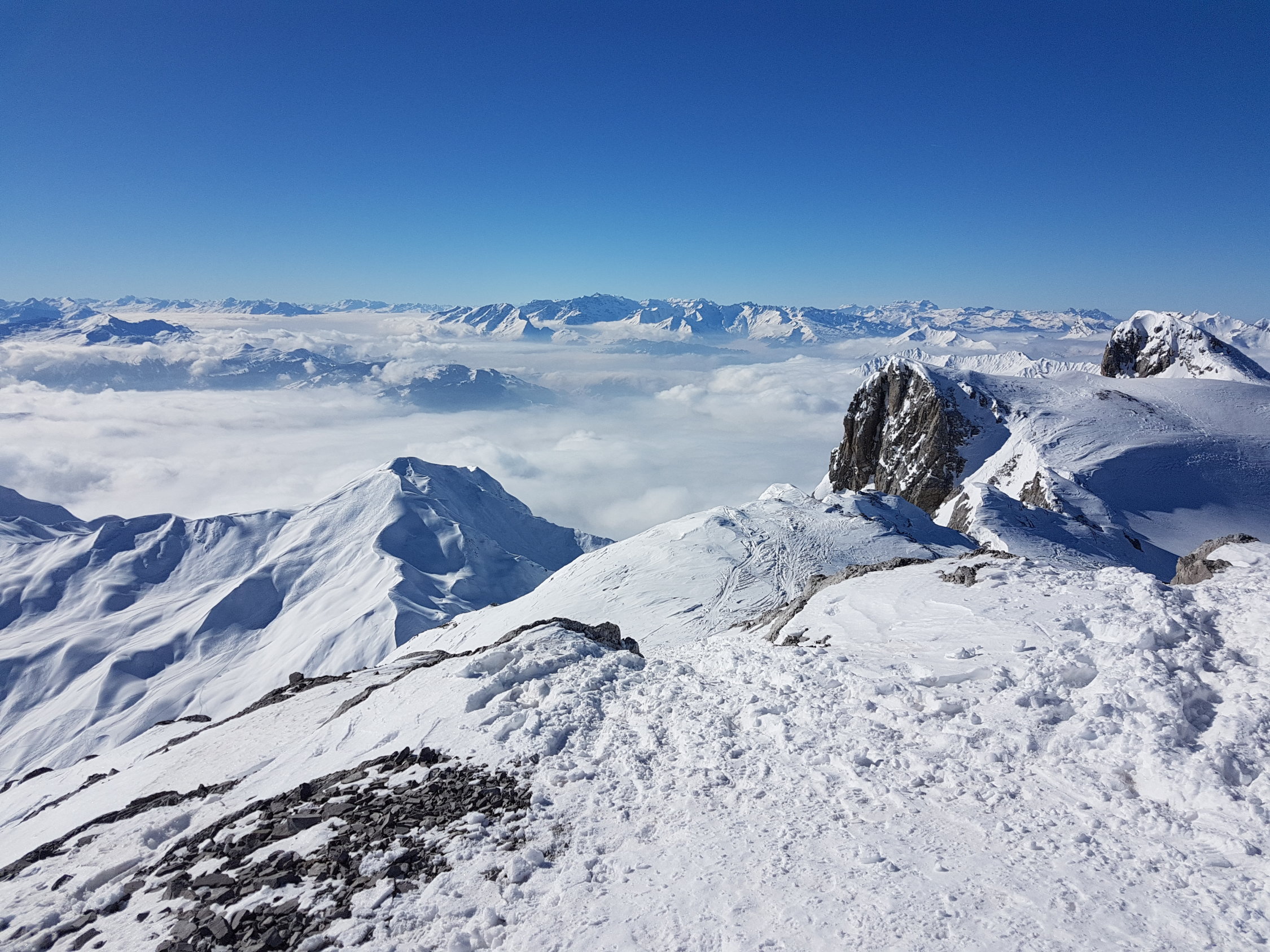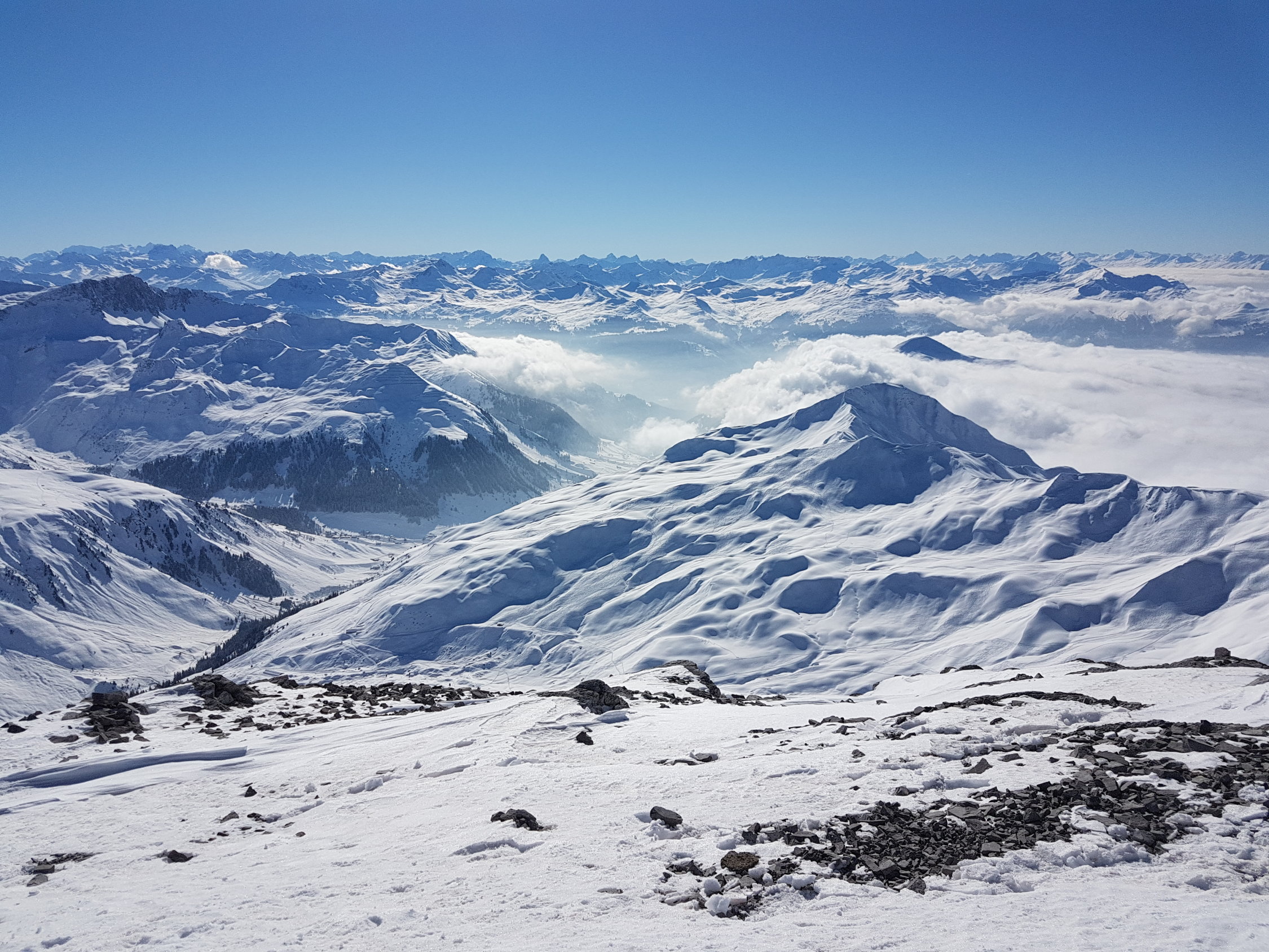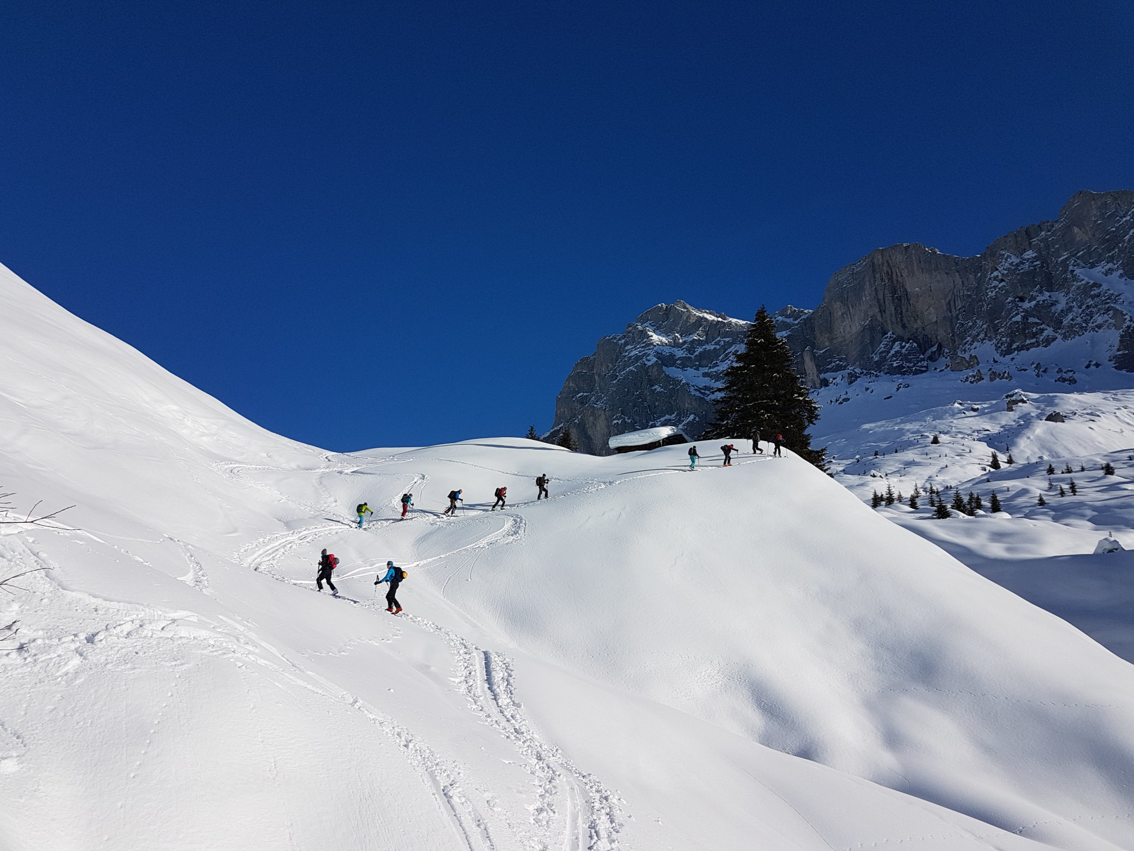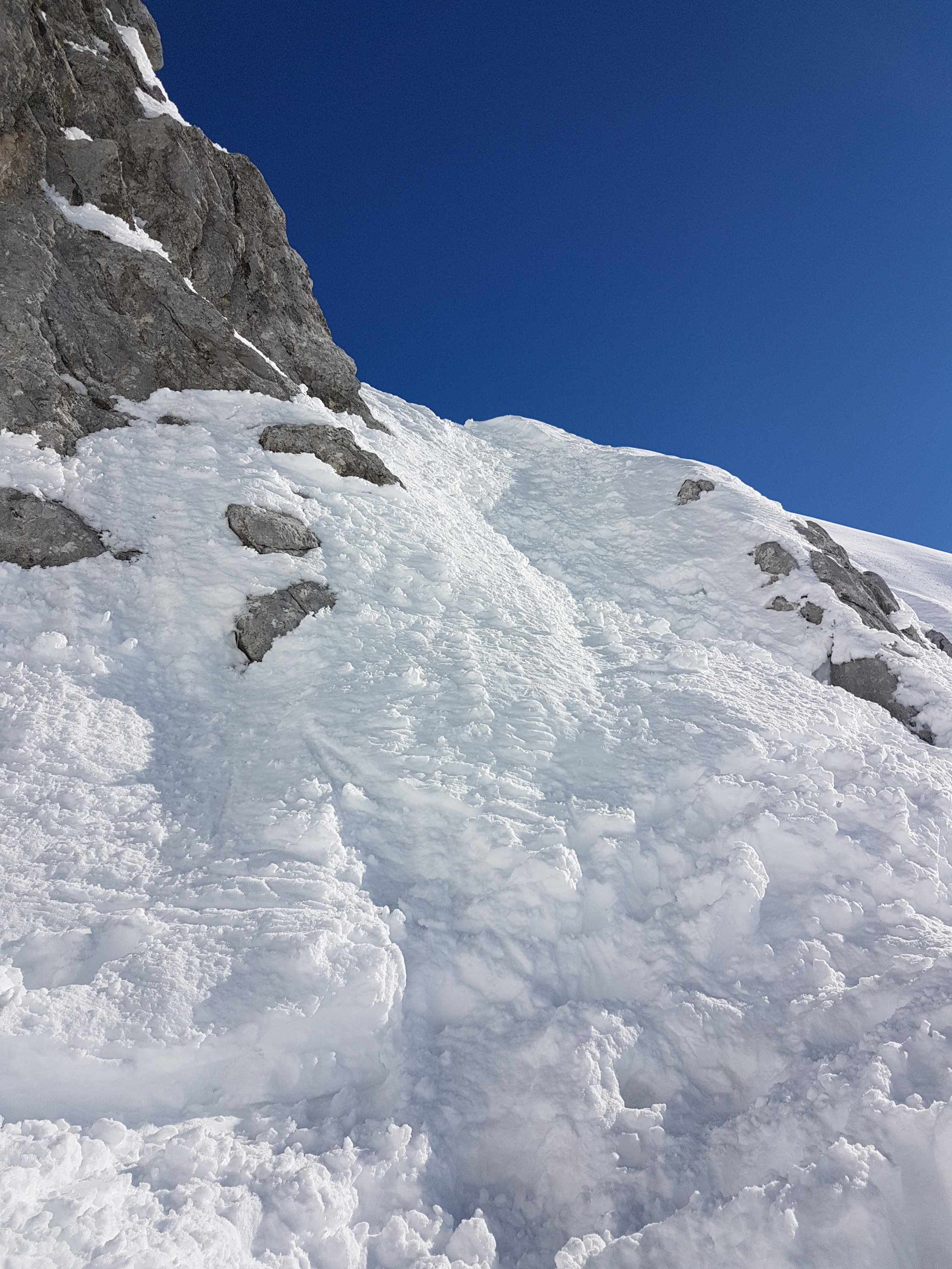 auf guter Spur bis kurz vor den Gipfel. Die Steilstufe in gutem Trittschnee problemlos ohne Pickel Steigeisen. Leider viel Bruchhasch; aber auch Pulver.