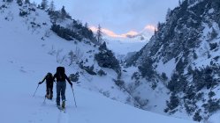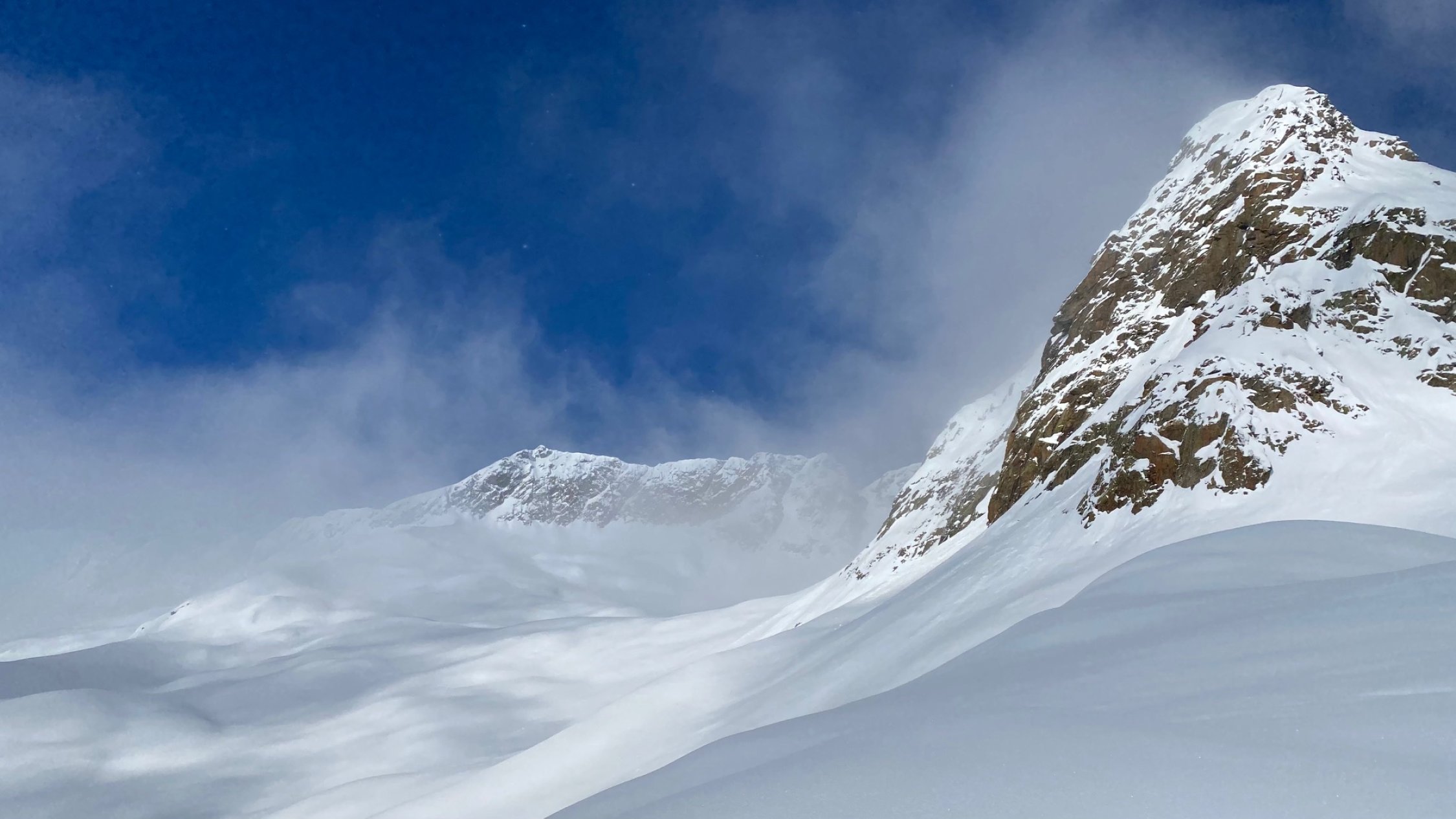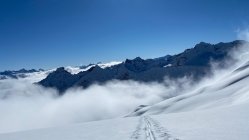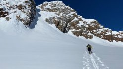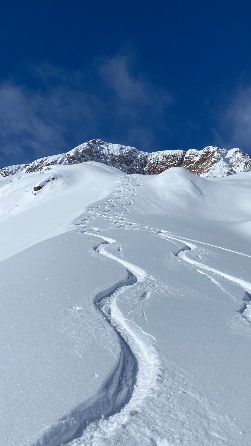 Gute Bedingungen. Beim Start -9Grad ohne Wind. Die letzte Spur der Vorgängen waren nicht mehr ersichtlich. Wind und Neuschnee hat winterliche Bedingungen geschafften. Die neue Spur musste mit viel Kraft neu angelegt werden. Die Sonne erwärmte die Luft. Lawinenhang einzeln ohne Gefahr durchlaufen. Couloir mit viel eingewehtem Wind. Teils mit Ski oder zu Fuss hochgegangen. Gipfel windig und kalt. Oberfläche abgeweht und eisig. Abfahrt unter 2200müM in den Schattenhängen mit Pulver, an Sonnenhängen mit leichtem Brucharsch.