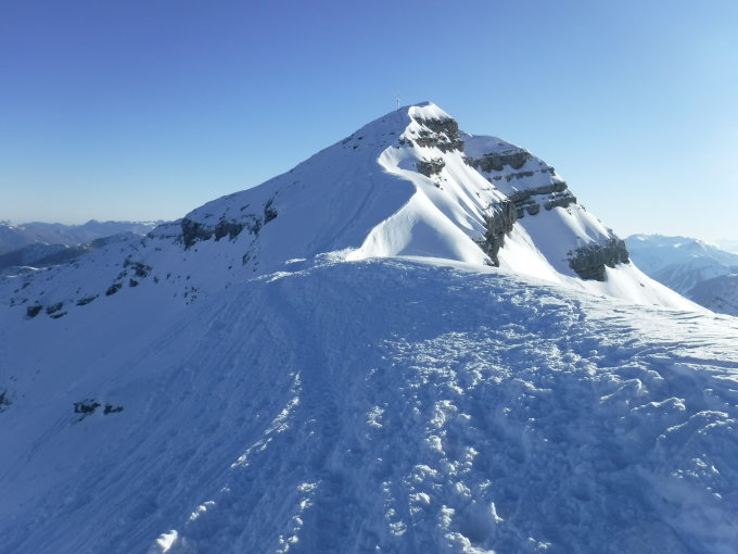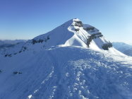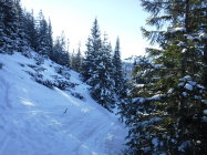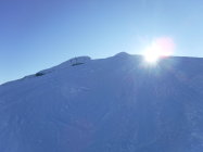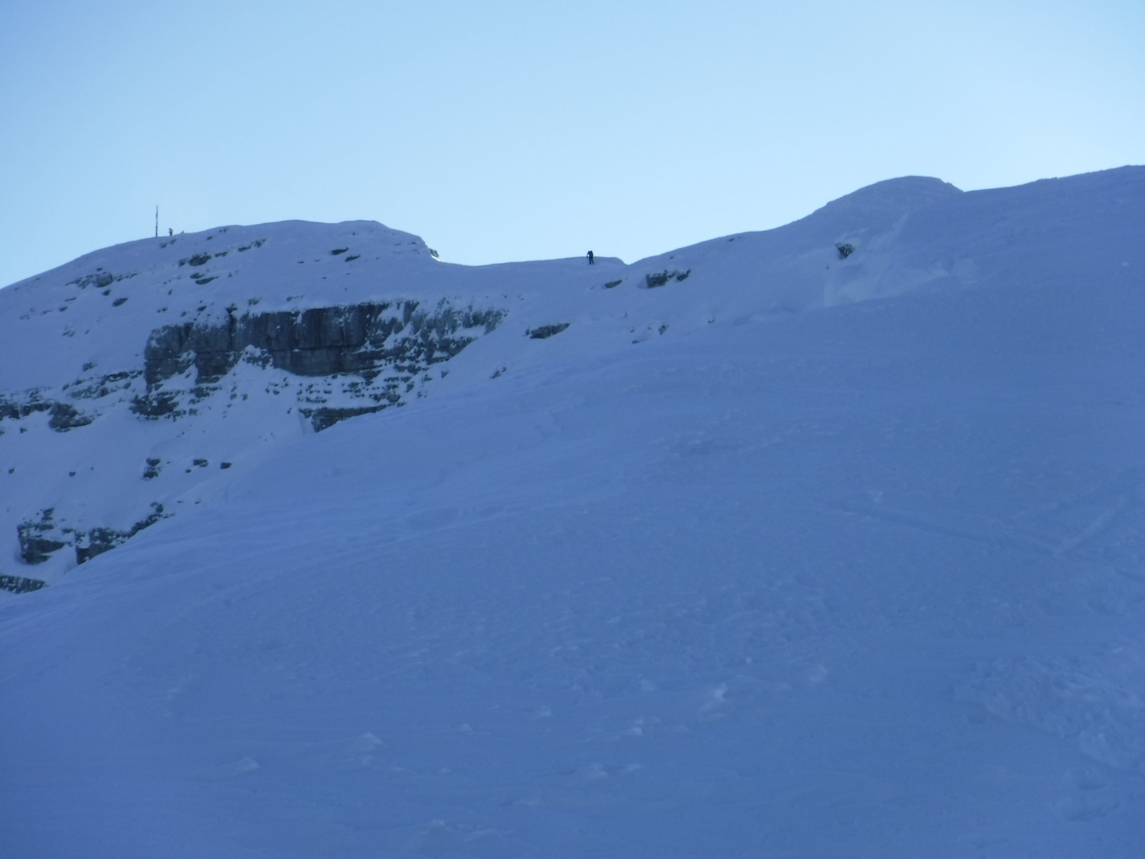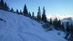 Tourenbeginn um 06:00 Uhr bei -16°C unter sternenklarem Himmel. Tagsüber wurde es in der Sonne -4°C warm. Nur kurzzeitig kam morgens der eiskalte Ostwind auf. Der Forstweg ist im unteren Drittel an einigen Stellen nicht, oder kaum schneebedeckt. Ein kleiner Murenabgang bescherte dem Forstweg an einer Stelle einen großen Felsstein mitten auf dem Weg und nach der Kehre darüber umgestürzte Bäume und Steine. Ab der Mooslahneralm lag ca. 10 cm Pulverschnee von vorgestern. Im Kammbereich herrschten windgepresste, oder abgewehte Verhältnisse. Eine gute ausgetretene Spur von gestern ist vorhanden („Autobahn“).