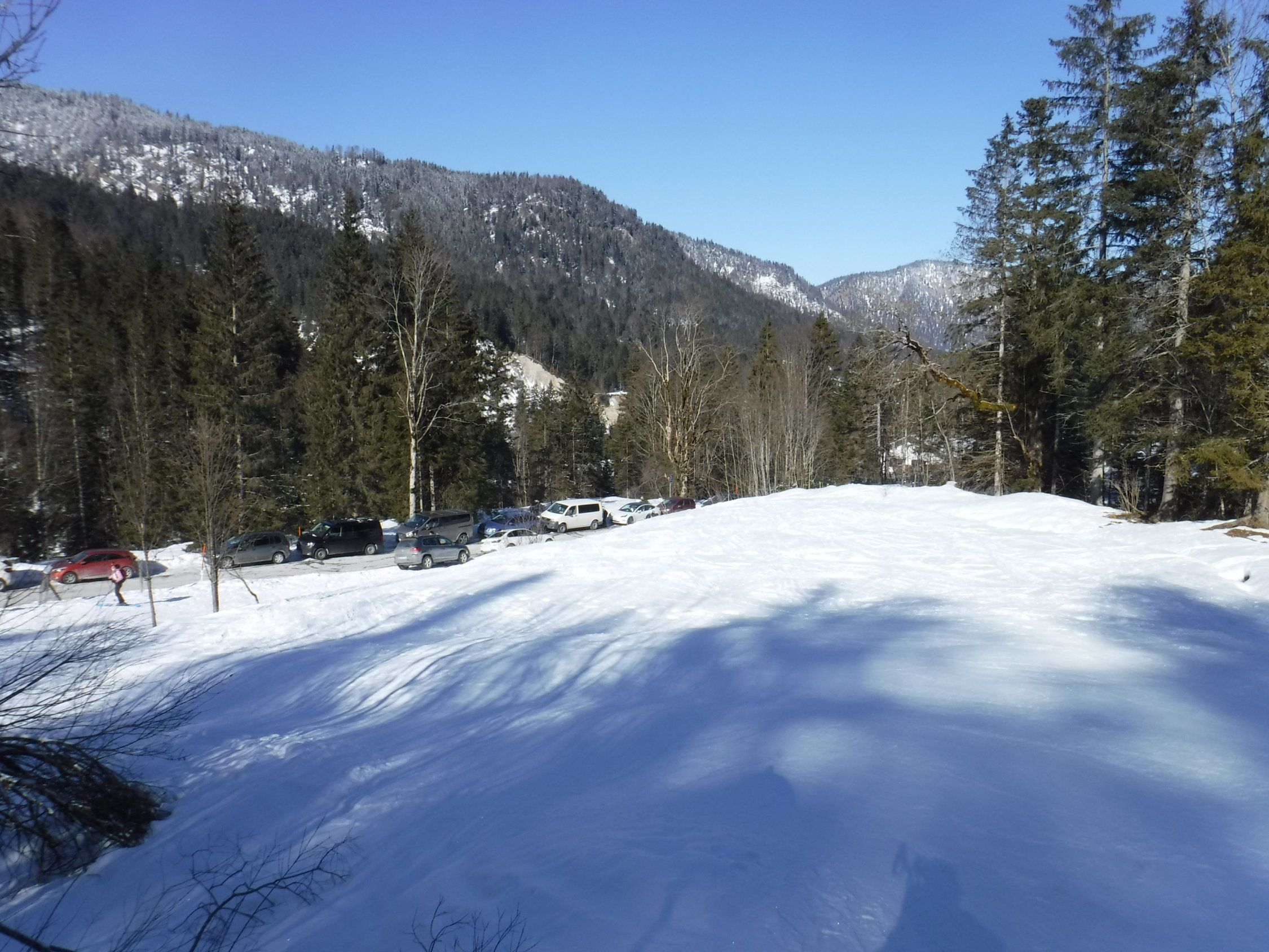 Ich war der erste am Morgen, der mit Sirnlampe startete. Dadurch konnte ich am 3. Parkplatzbereich direkt gegenüber dem Anfang des Forstweges parkieren und gleich die Schneeschuhe anschnallen. Unterwegs überholten mich 6 Skitourengänger, die ich am Depot, bzw. am Gipfel wieder antraf (09:00 Uhr). Im Abstieg begegneten mir über 200 Skitourengänger, sowie 3 SS-Läufer und 2 Fußgänger mit Hund.