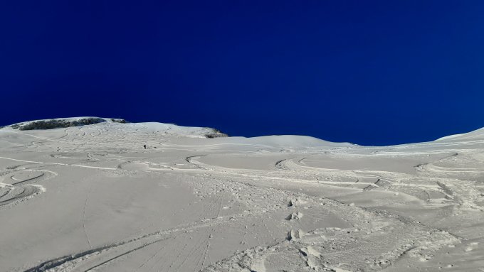 Start bei minus 15 Grad auf entspannter Aufstiegsroute bis zum Gipfel. Hänge mit Powder bis auf die Querung unterhalb vom Böli. Hier schon Firn, am Nachmittag scheints aufgesulzt, was man an den tiefen Mulden der Abwärts watschelnden Schneetourengängern der Vortage entnehmen kann. Warum die in der Spur runter laufen müssen erschliesst sich mir dort nicht.