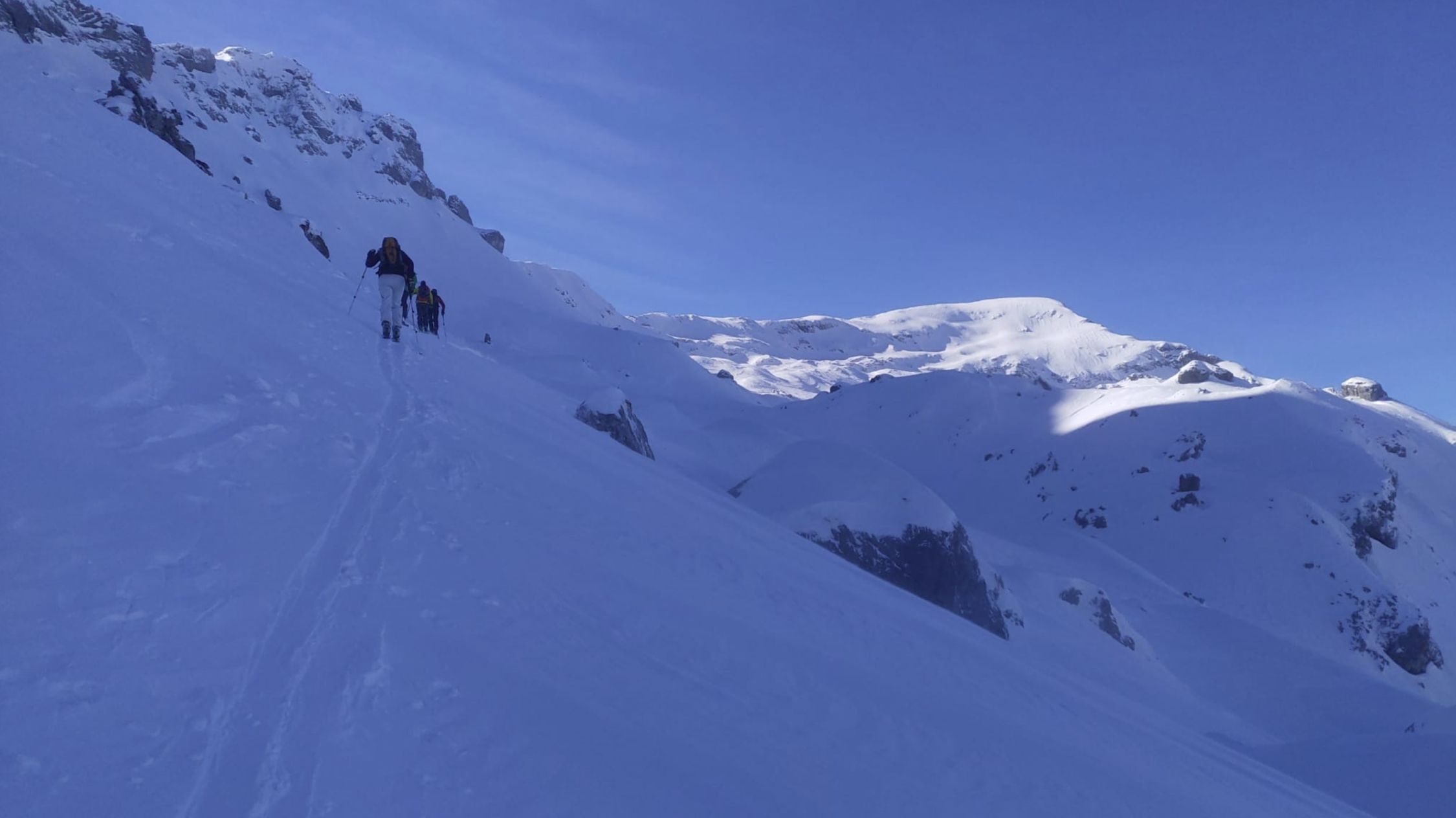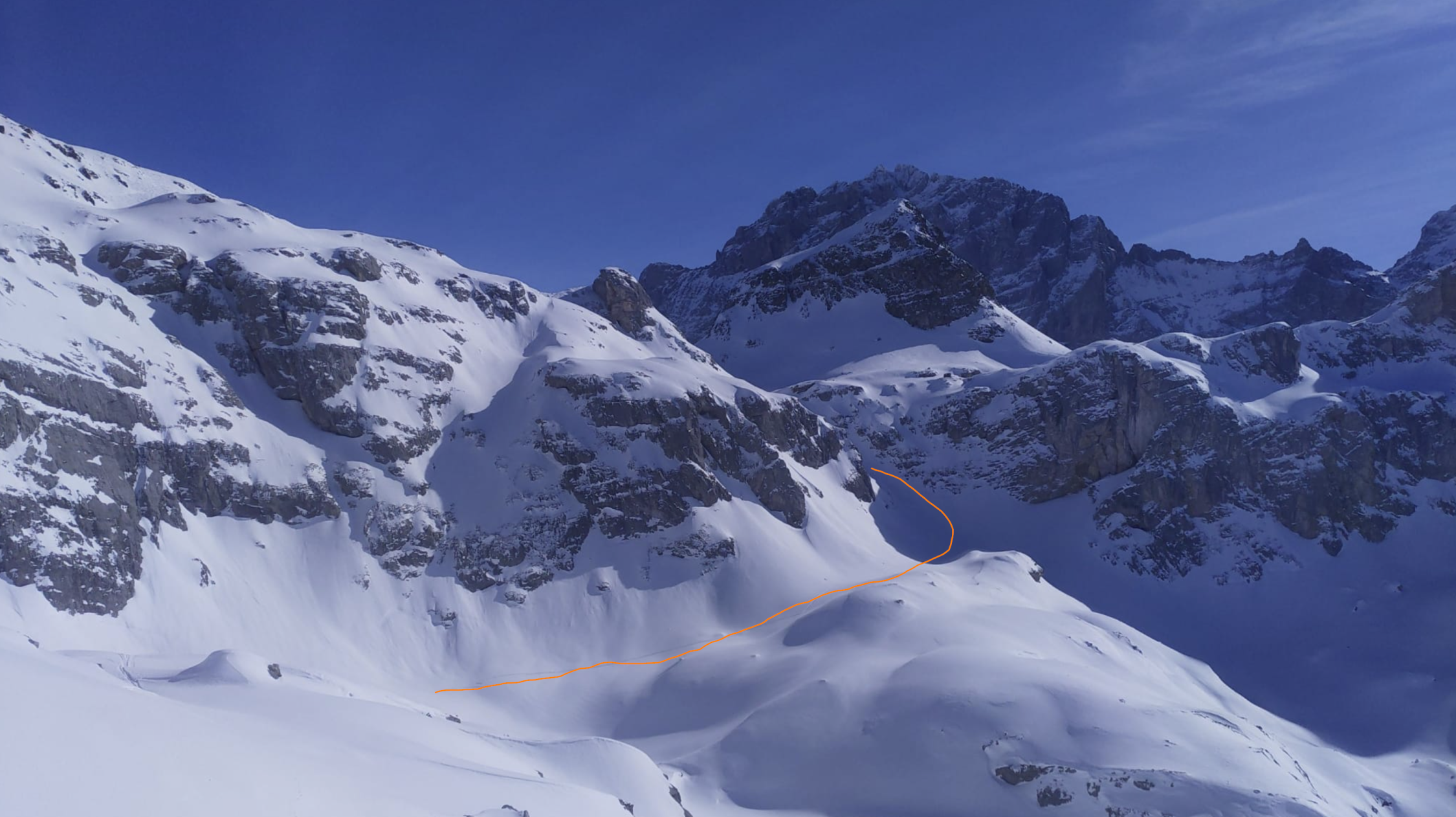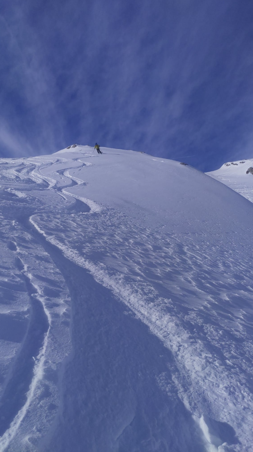 Nach einer kurzen Abfahrt zum Lang Büel mit Fellen erwartete uns eine perfekte Spur durch das Colouir zum Punkt 2366. Von dort aus einer gute angelegten Spur zum Hoch Fulen.