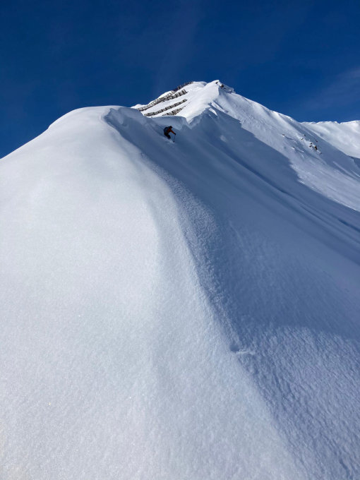 Überschreitung von SW nach NO, dort am Grat etwas abgefahren, dann über schöne Mulden in der NO-Seite und querend nach S zur Aufstiegsspur zurück, lohnender Umweg