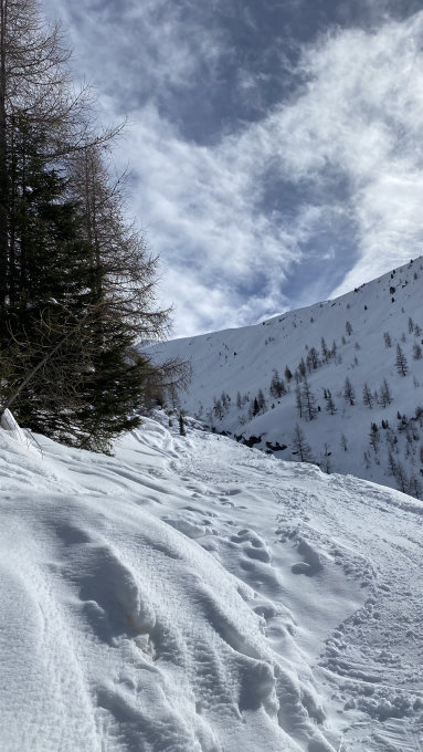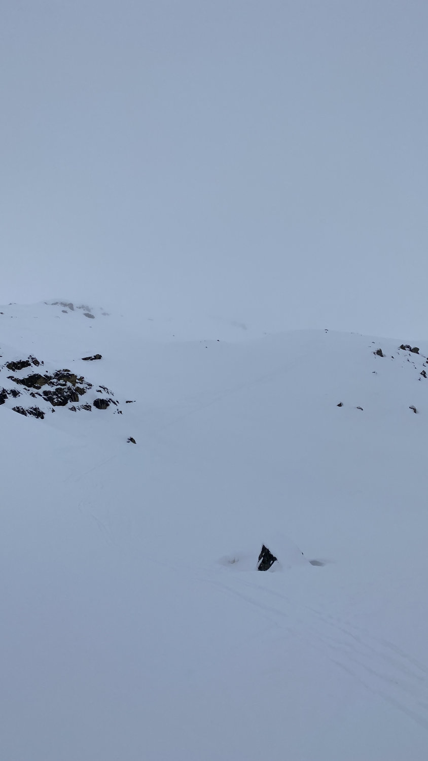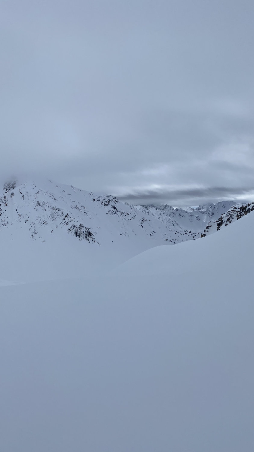 Eine gut angelegte Spur ist vorhanden. Im grossen und Ganzen gute Verhältnisse jedoch liegt im Schlusshang ca 20cm windverfrachterter Neuschnee. In Kombination mit der sehr sehr bis hin zu gar keine Sicht, entschlossen wir uns auf der Höhe 2840 umzudrehen. Dafür wurden wir mit dem Pulverschnee in der Abfahrt belohnt.