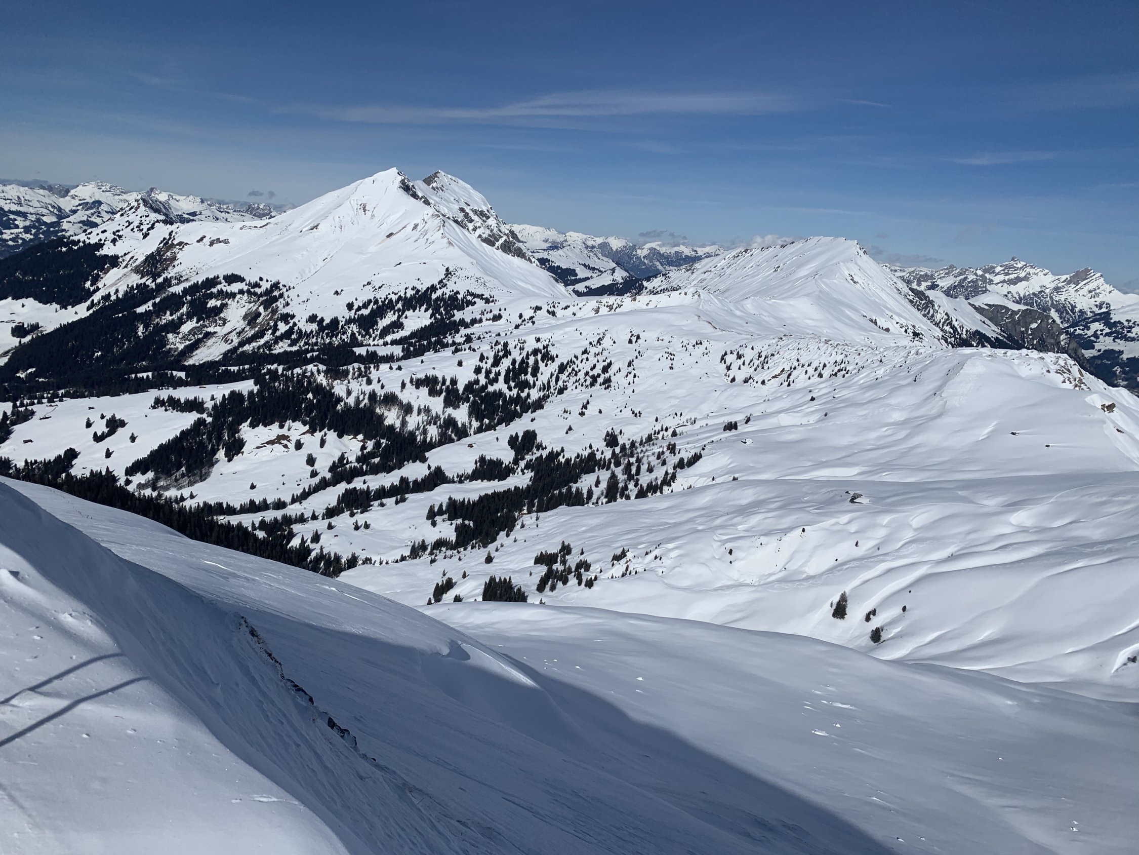Traumhafte Verhältnisse, nach dem nächtlichen Schneefall hatten wir eine feine Neuschneeschicht. Nur an der Lenk noch etwas Nebel danach strahlend schön. Einzelne Abgänge der letzten Tage aufgrund des warmen Wetters. Auf dem Gipfel eine kalte Bise. Weiter unten wieder angenehme Temperaturen. Das letzte Stück zurück zur Hubelmatte im Schatten mühsame gefrorene Abfahrt.