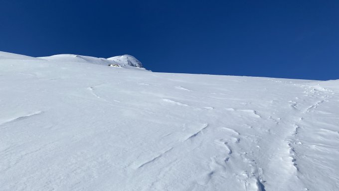 Abfahrt über NO-Flanke, immer noch Traumpulver dort, bis fast unten. Unterster Hang hatte beim Hochlaufen einen argen Deckel, der am Nachmittag mutet Wärme aber zu schwerem Pulver mutierte.