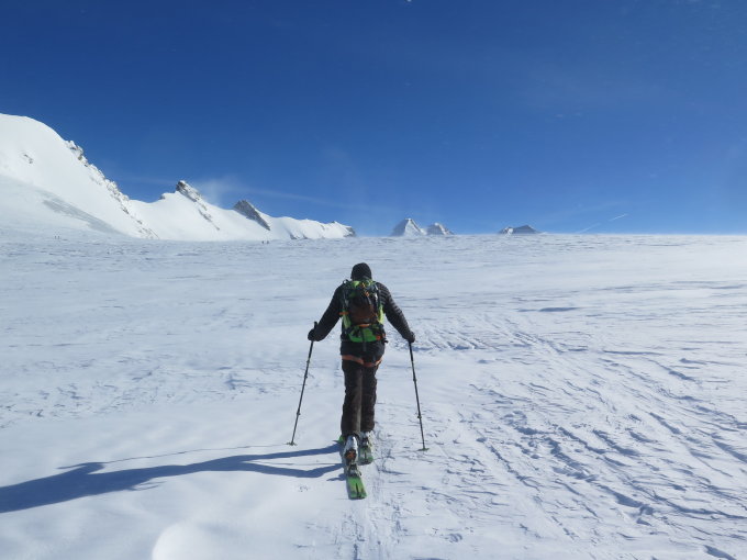 Nach dem Breithornpassplateau mehrheitlich der Piste nach Zermatt.