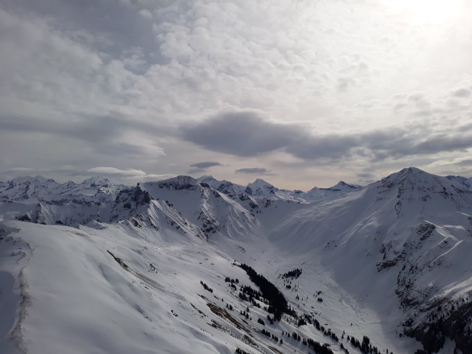 Die Aufstiegsspur ist bis auf 1700m zum Teil sehr hart. Die Harsteisen sind hilfreich. Ab 1700m bis zum Skidepot auf 2300m wechselt der Schnee von zuerst Bruchharst zu Pulver. Die Abfahrt war oben gut mit frischem Pulver, unten vermehrt Bruchharst. Ab 1700m pickelhart und alles verfahren. Daher das Smiley machbar.