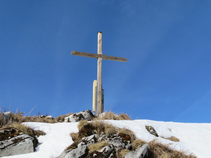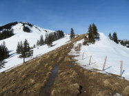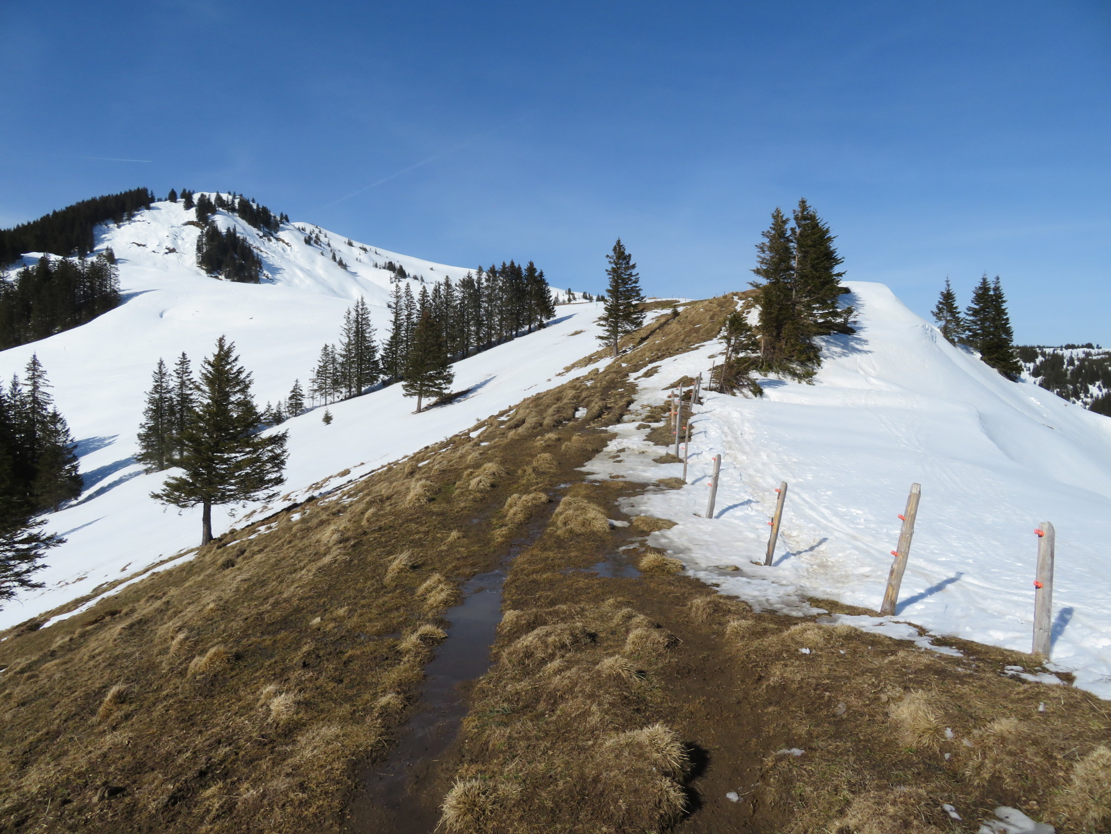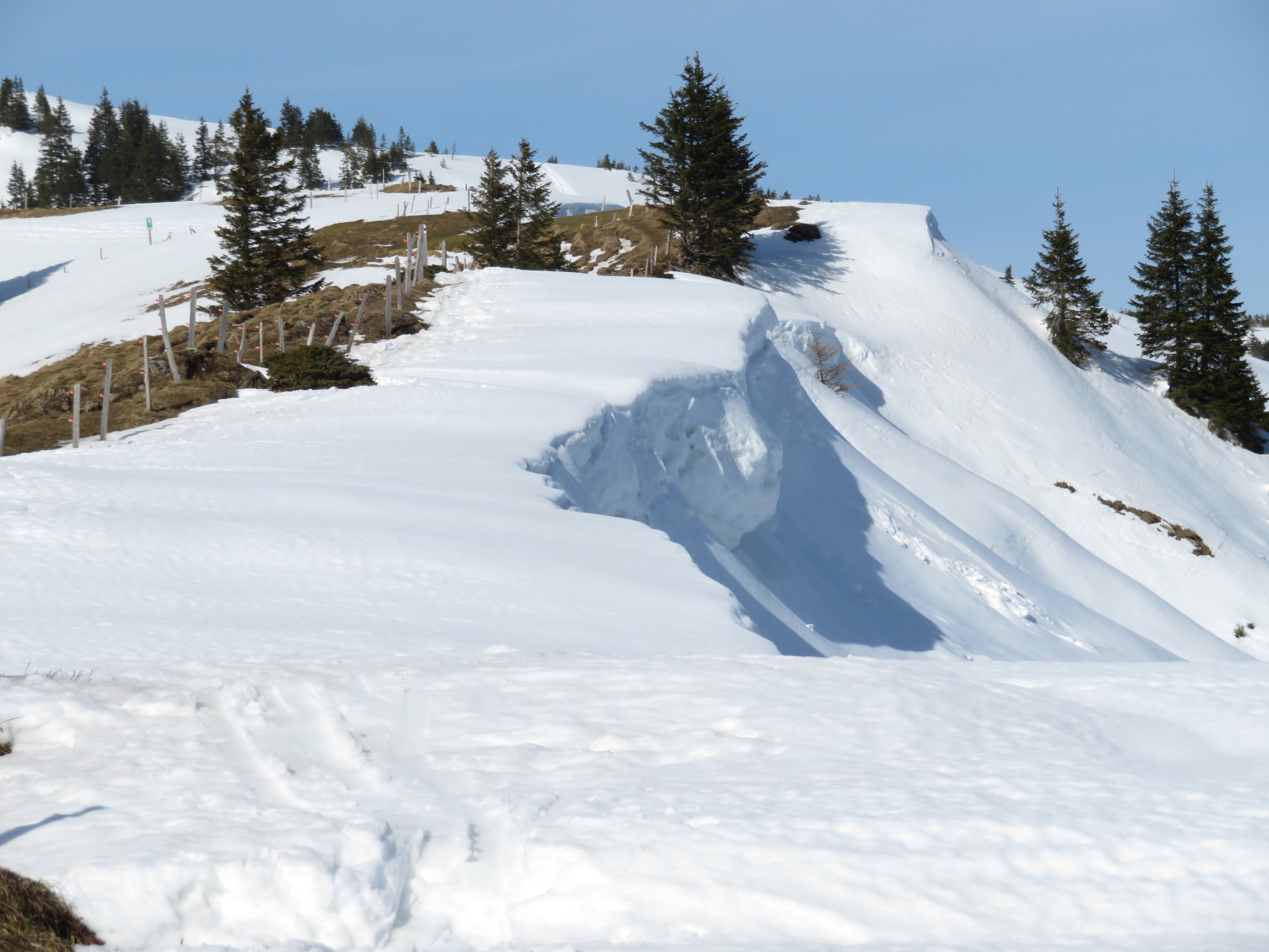 *Auf dem Grat ist eine beachtliche Wechte. Es empfiehlt sich ganz nahe an den Weidpfälen entlang zu gehen. Die Risse sind sichtbar.