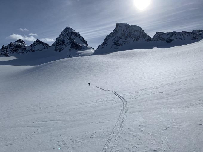 Skidepot am Piz Buin Grond Gipfelaufbau gegen 3080 m oberhalb der Buin Lücke. Man könnte noch etwa 50 m höher mit Ski, das machte für uns in dem windverpressten Hang aber wenig Sinn. Gipfelaufstieg Buin problemlos, meist guter Trittschnee. Im Couloir bei der Abfahrt ein frischer Nassschneerutsch. Gut fahrbar trotz Anfeuchtung. Aufstieg via Plan Rai bis P 2847 auf guter Spur, der Bogen nach Süden über das Vadret Tiatscha dann kurz wingepresst, eisig. Die Querung unterhalb des NW-Grats des Piz Fliana ist insbesondere im Bereich P3111 sehr heikel. Hangneigung 35 - 40 Grad, nach unten steil über Felsstufe abbrechend. Wir waren bereits drei Tage im Gebiet unterwegs und haben keine Gefahrenzeichen, auch in steileren Hängen, wahrgenommen. Das Altschneeproblem ist aber präsent (wie wir am Tag darauf unterhalb der Dreiländerspitze, siehe Eintrag, auch realisieren mussten). Da hilft es wenig zu wissen, dass das Problem vllt. markanter im zentralen Graubünden und Engadin ist. Wir würden von der Querung definitiv abraten, geringe Eintrittswahrscheinlichkeit aber maximale Folgen. Warnzeichen werden hier die letzten sein.