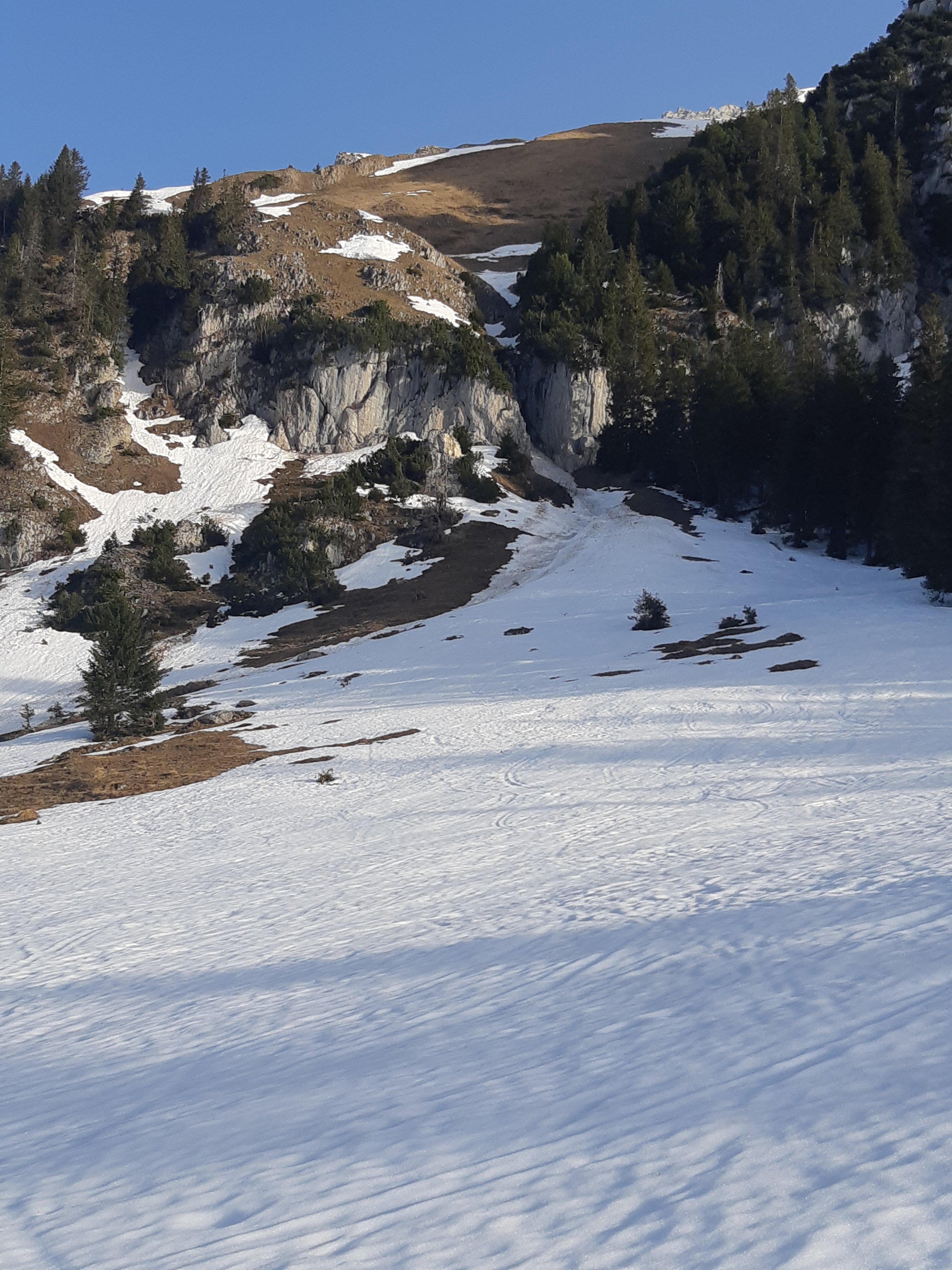 Es hat einige Anrisse von Gleitschnee...sind auch einige Lawinen schon abgegangen....