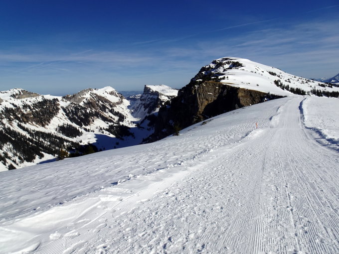 Die alte Spur war meistens tragfähig. Im Abstieg um ca 11Uhr sank ich teilweise ein. (Keine Schneeschuhe) Abstieg problemlos. Die wenigen Tourenfahrer konnten den Südhang vor dem Mittag gut befahren.