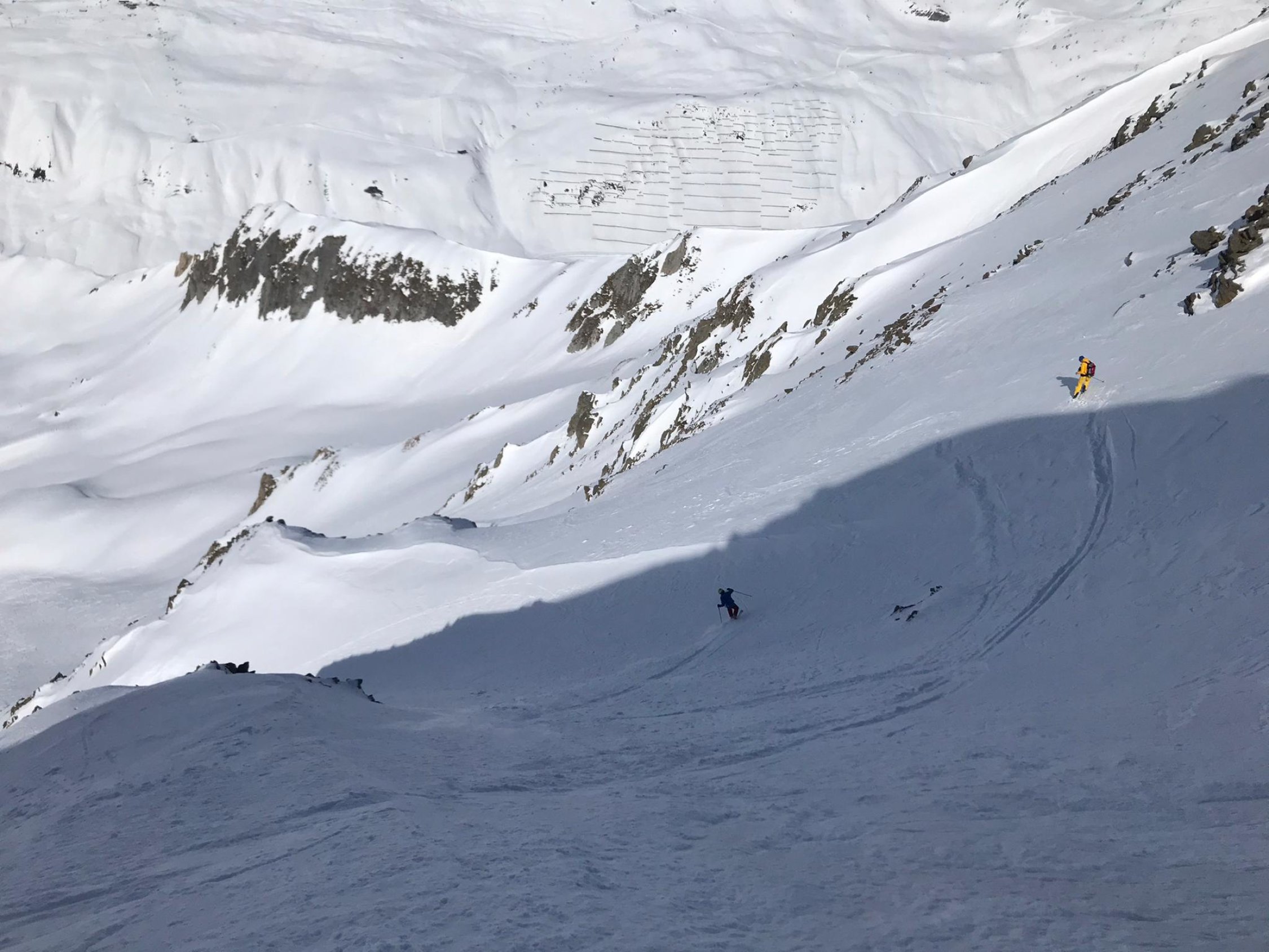 Die Abfahrt haben wir über das Couloir mit Einstieg direkt am Gipfelkreuz gemacht. Die normale Abfahrt in Richtung Andermatt war schon stark verfahren. Der Schnee war noch erstaunlich pulverig. Nach dem Steilhang hatte es immer noch einigermassen guten Pulver. Weiter talwärts wurde der Schnee dann sulzig. Alles in allem viel bessere Schneeverhältnisse als zunächst angenommen.