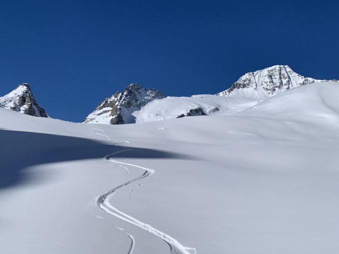 Zuerst aufs Chli Bielenhorn, dann Abfahrt in tollem Pulver nördlich an der Albert Heim Hütte vorbei bis ca 2350. Aufstieg auf guter Spur, mittlerweile etwas aufgefirnt bis zum Skidepot oberhalb der Winterlücke, ca 2950. Nun zu Fuss in gutem Trittschnee (Steigeisen angenehm, ging aber auch ohne) zum Gipfel.Abfahrt zum Göscheneralpsee am Anfang noch Pulver, dann aber alles Windharst, nicht so spassig. Traverse über dem See ok, viele Lawinen sind schon unten.