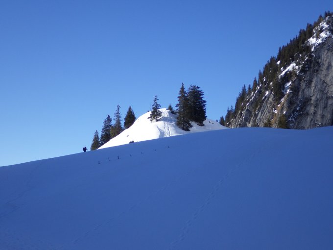 Lange Tragestrecke von Schwarzsee bis zm Waldbeginn (Bach) oberhalb von Unter Bödeli. Dann durchgehend harte Schneedecke bis Ritzlialp. Voller Eintritt in die Morgensonne. Gute angelegte Aufstiegsspur im schon leicht aufgesulzenen Schnee. Via Fochsen an der Hütte vorbei und durch die Mulde im Bogen in den Gipfelhang. Abfahrt nicht der Aufstiegsroute entlang, sondern mehr oder weniger direkt in der Falllinie Richtung Euschelspass. also östlich am Pkt. 1790 vorbei. Zwischen 11:00 und 12:00 Uhr schon kräftig aufgesulzener Schnee, aber gut und sicher fahrbar. Ab Ritzli bis Schönbödeli überwiegend harte tragende Schneedecke. Gegenaufstieg(teilweise schon aper) zur Riggisalp und Fahrt auf der Piste nach Schwarzsee.