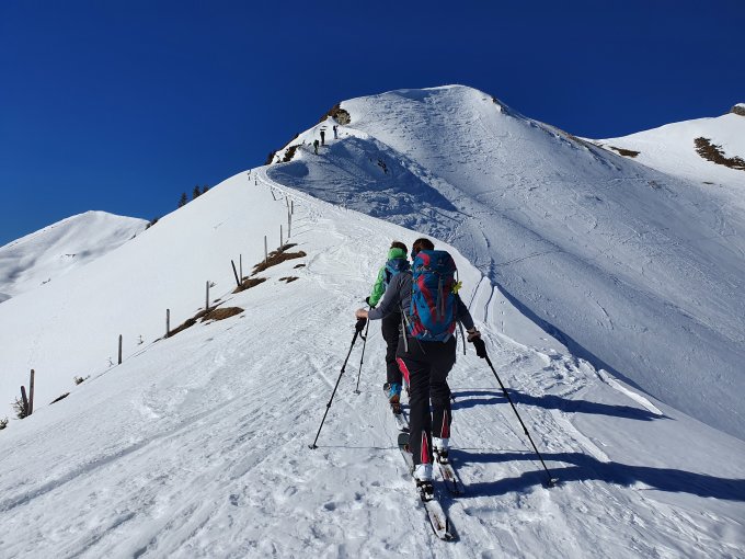 Gipfelhang technisch etwas anspruchsvoller, Harscheisen von Vorteil. Gipfelhang kann gefahren werden.