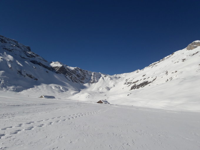 Schönster Sulzschnee von oben bis unten, nur an wenige (schattige) Stelle gefroren.