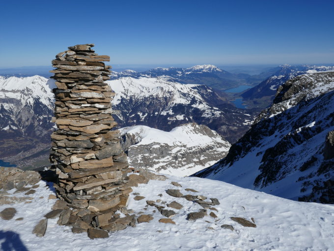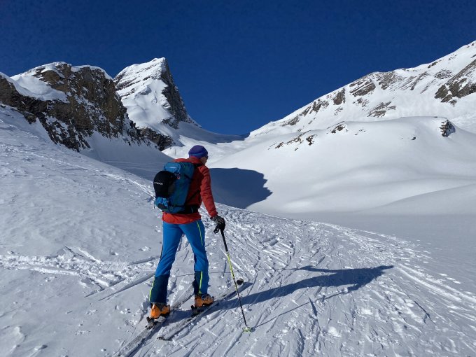 Gefroren im Aufstieg, dann zunehmend aufgesulzt oder Pulver, Presspulver, Gipfelhang bis halb hinauf mit Schnee, dann zwingend zu Fuss auf dem Wanderweg hoch. Abfahrt Wischbächital 12 Uhr höchste Zeit zu fahren. Zwei grosse Rutsche sind schon runter, hübsch zum Fahren im Schatten des Schwarzhornes natürlich noch Pulverschnee.