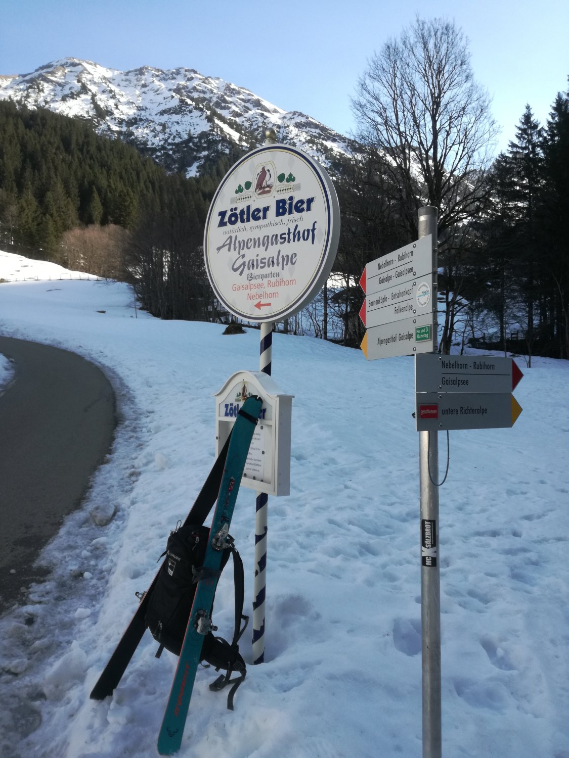 Ab Reichenbach Parkplatz Gaisalpe zu Fuß bis zur Brücke unterhalb Gaisalpe. Ab hier mit Ski zum Forstweg Richtung Rubialpe ( nur ca. 50m schneefrei ) und dem Sommerweg zur Falkenalpe - Südgrat zum Gipfel. Abfahrt 10.30Uhr über aufgefirnte Südhänge in die Mulde und Wiederaufstieg zum Grat zur Westabfahrt -noch hart gefroren- zurück zur Gaisalpe.