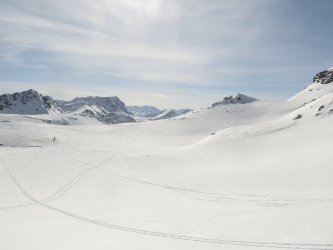 Wir machten die Tour vom Parkplatz La Veduta bis zur Jenatsch Hütte. Die ersten paar Meter hatten wir kalten Wind, der dann mit der Zeit nachgelassen hart. Bis zum Gipfel war der Schnee recht hart und am Gipfel fing der Wind wieder recht heftig an zu blasen. Man muss am Grat recht weit nach rechts laufen, dann kann man dort recht einfach herunterfahren. Um an der Hütte nicht allzufiel stöckeln zu müssen, sind wir so weit wie möglich links am Hang entlang gefahren. Bitte beachtet die Lawinensituation, da der hang dort recht steil ist.
