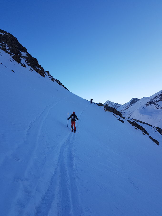 Wir sind morgens um 8 Uhr von der Hütte los und am Hang recht weit oben traversiert. Es war recht harschig, aber wir konnten auf der alten Spur ohne Harscheisen laufen. Wenn man um den Hang herum ist, geht es recht flach weiter. Den Piz Laviner kann man recht bald auf der rechten und den Piz Jenatsch auf der linken Seite sehen. Ganz am Ende des Plateaus muss man dann an einem recht steilen Hang nach links traversieren. Das ging aufgrund der alten Spur ohne Harscheisen. Unter der Piz Laviner kommt dann das Skidepot. Die Spuren hoch zum Gipfel waren so gut, dass man nicht einmal die Steigeisen gebraucht hat. Wir sind dann weiter zum Piz Jenatsch auf der anderen Seite