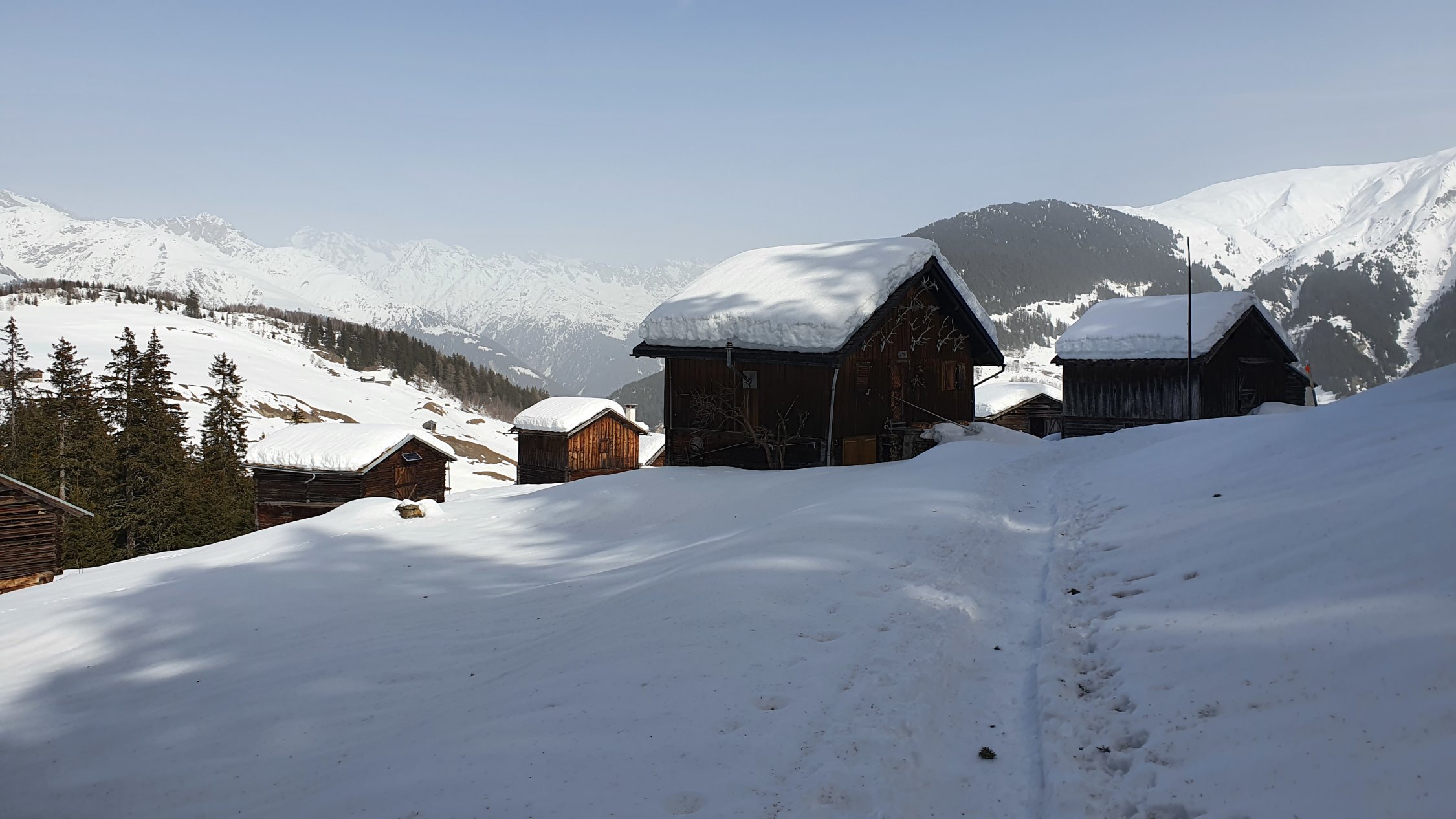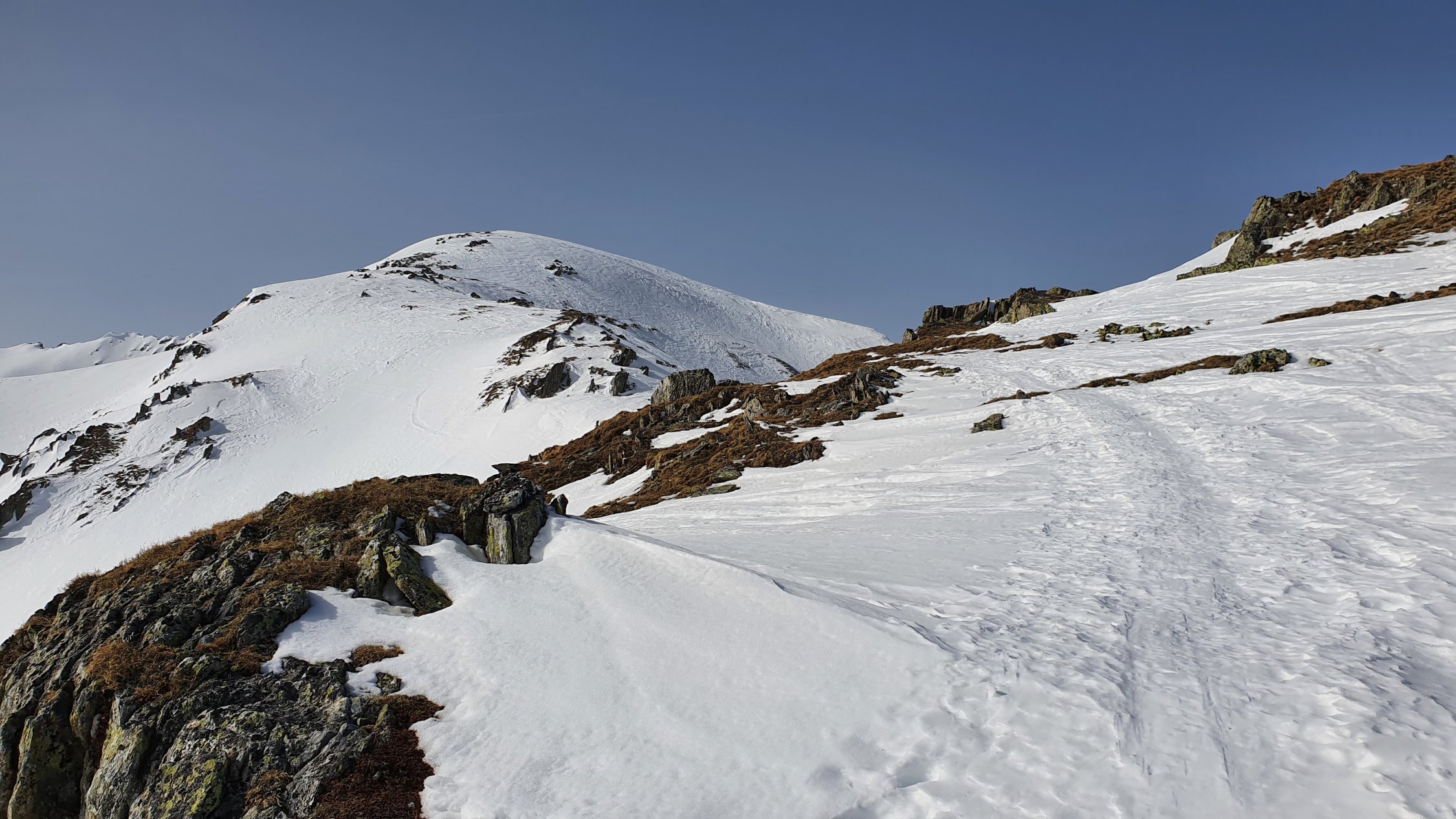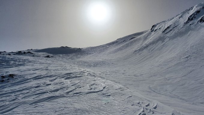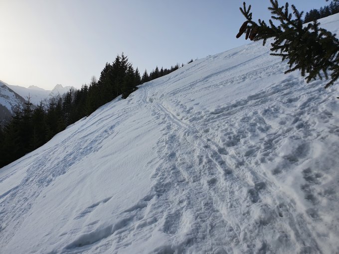 Am morgen um 8:00 waren Harscheisen im schattigen Aufstieg vorteilhaft. Im oberen Bereich auf hartgepresster Unterlage gings ganz gut ohne. Abfahrt um 12:00 vom Gipfel Rtg. Alp Pazzola, im Schatten auf griffigem Hartschnee, bei Sonneneinstrahlung leicht aufgeweicht, Schlusshang zum PP Plaun Pali schöner Sulzschnee.