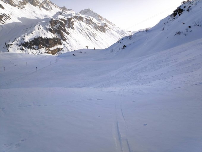 Skipisten sind gesperrt. Aufstieg bis Bergstation Albona I gut neben der Piste möglich. Danach keine Piste und gute Spur im freien Gelände.