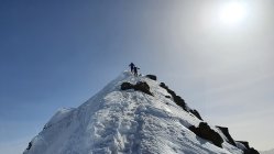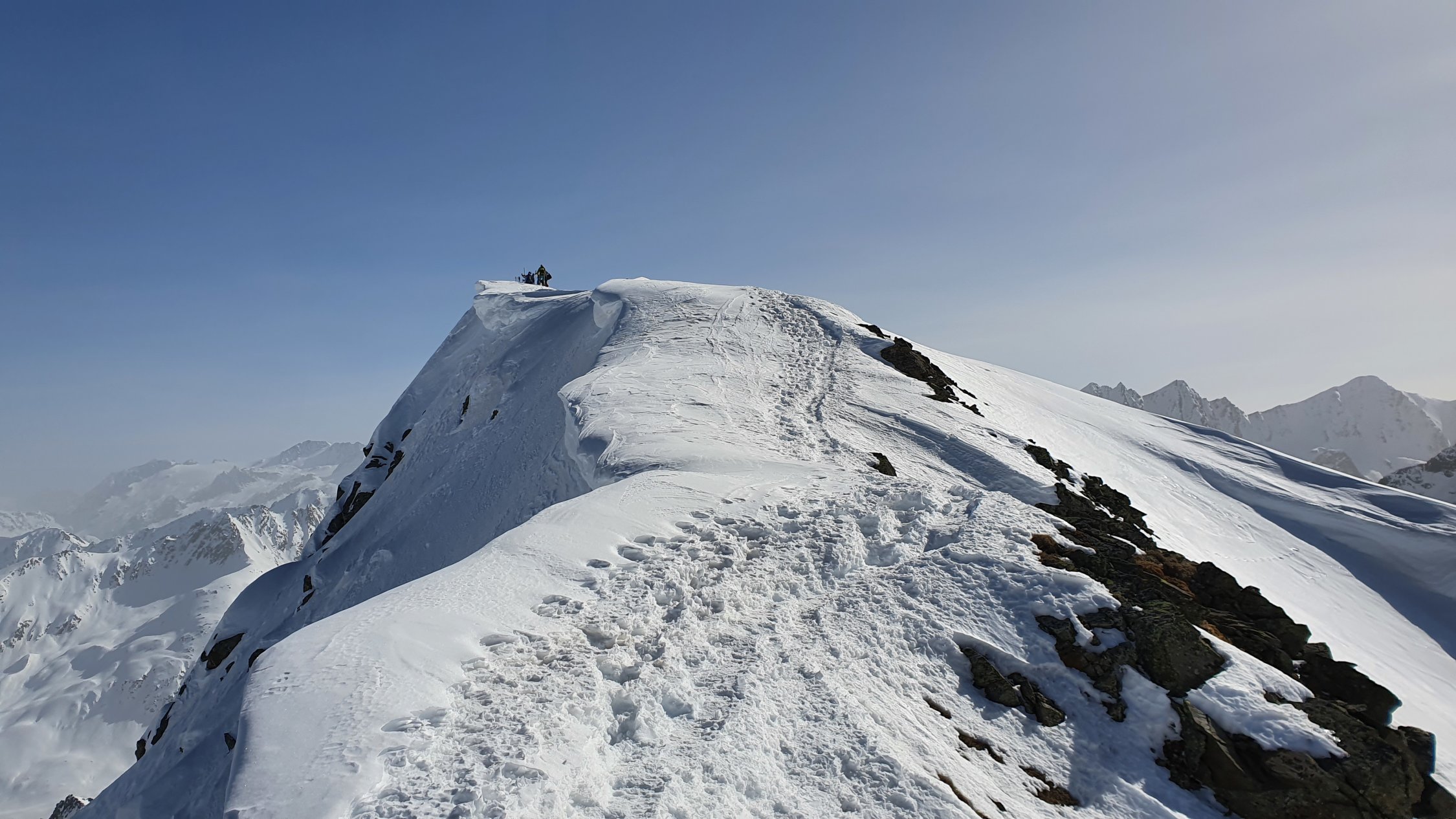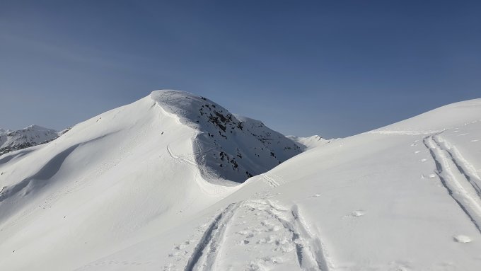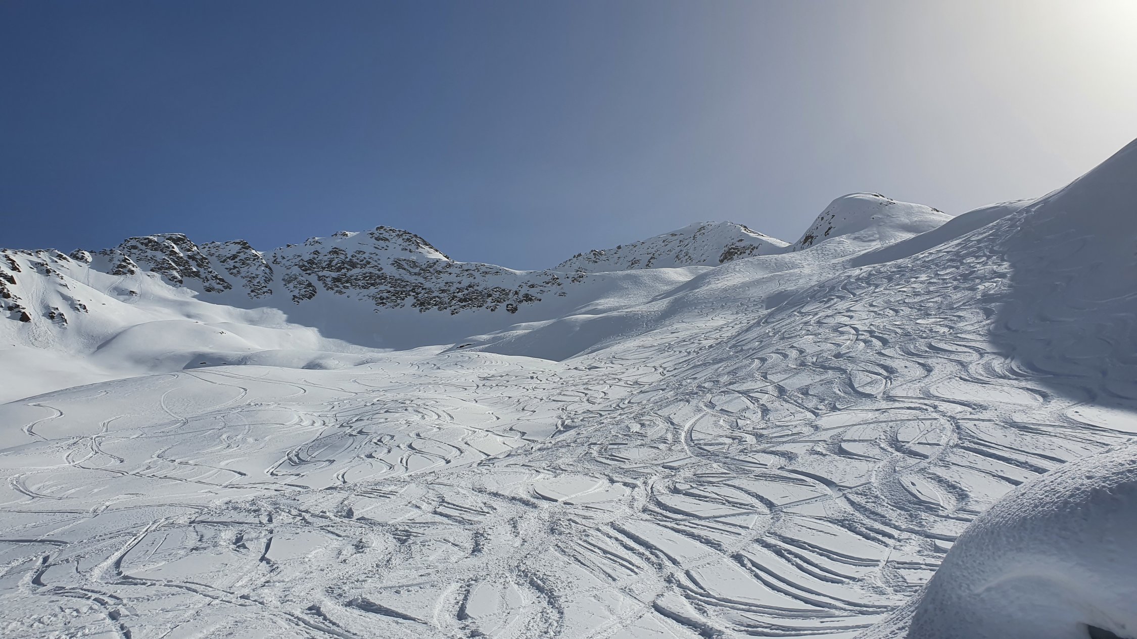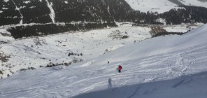 Von der Bergstation Tgom über den Rücken zum Gareres dil Tgom und bis zum Skidepot gute Aufstiegsspuren auf hartgepresster Unterlage. Ebenso die kurze Abfahrt dazwischen zum Pt. 2400. Fussaufstieg zum Gipfel gut machbar ohne Steigeisen. Abfahrt um 12:00 nach Selva im oberen Bereich griffig und hartgepresst, im Schatten teilweise Pulver vorhanden, weiter unten frühligshaft..von Sulz bis Nassschnee.