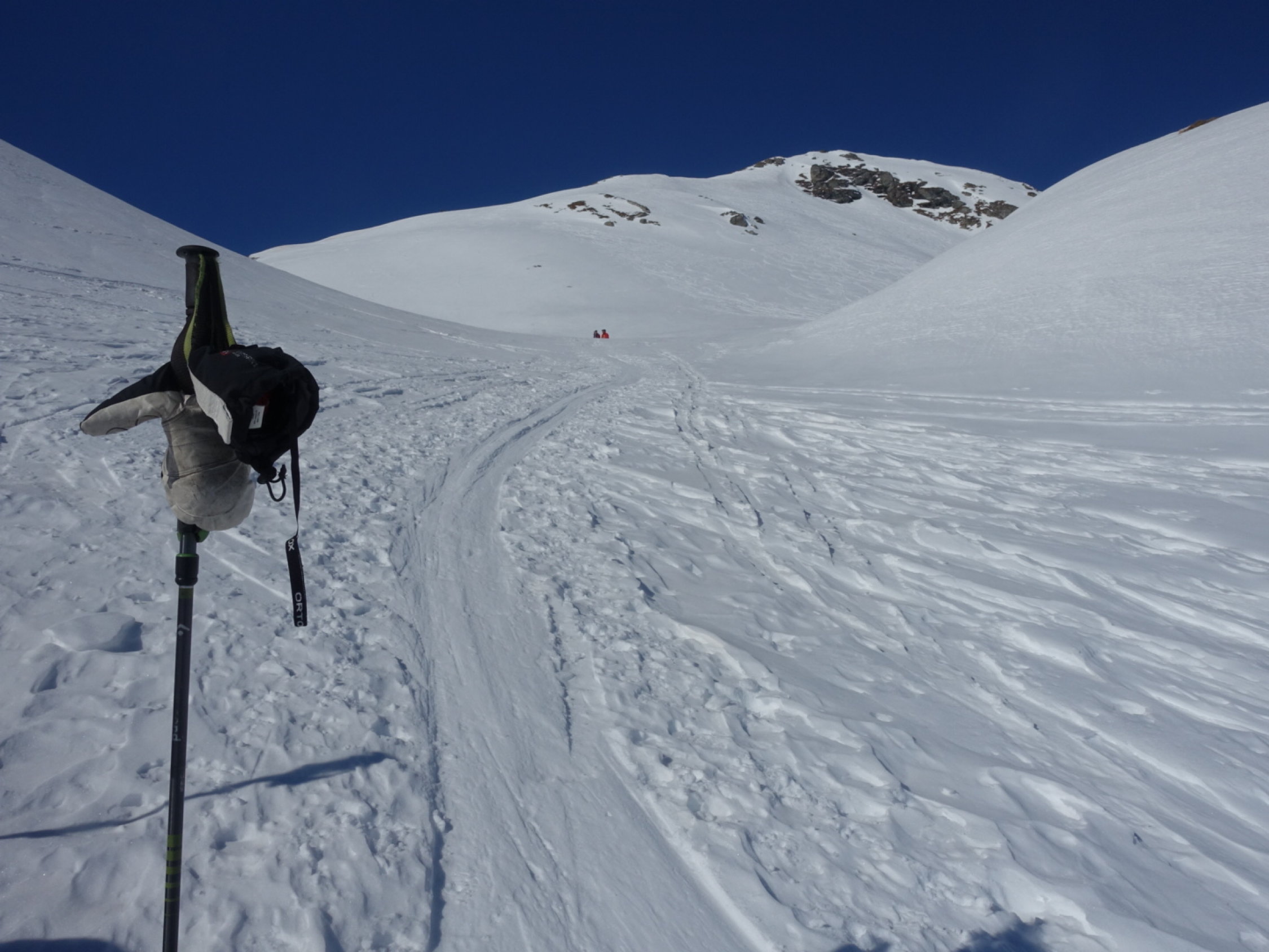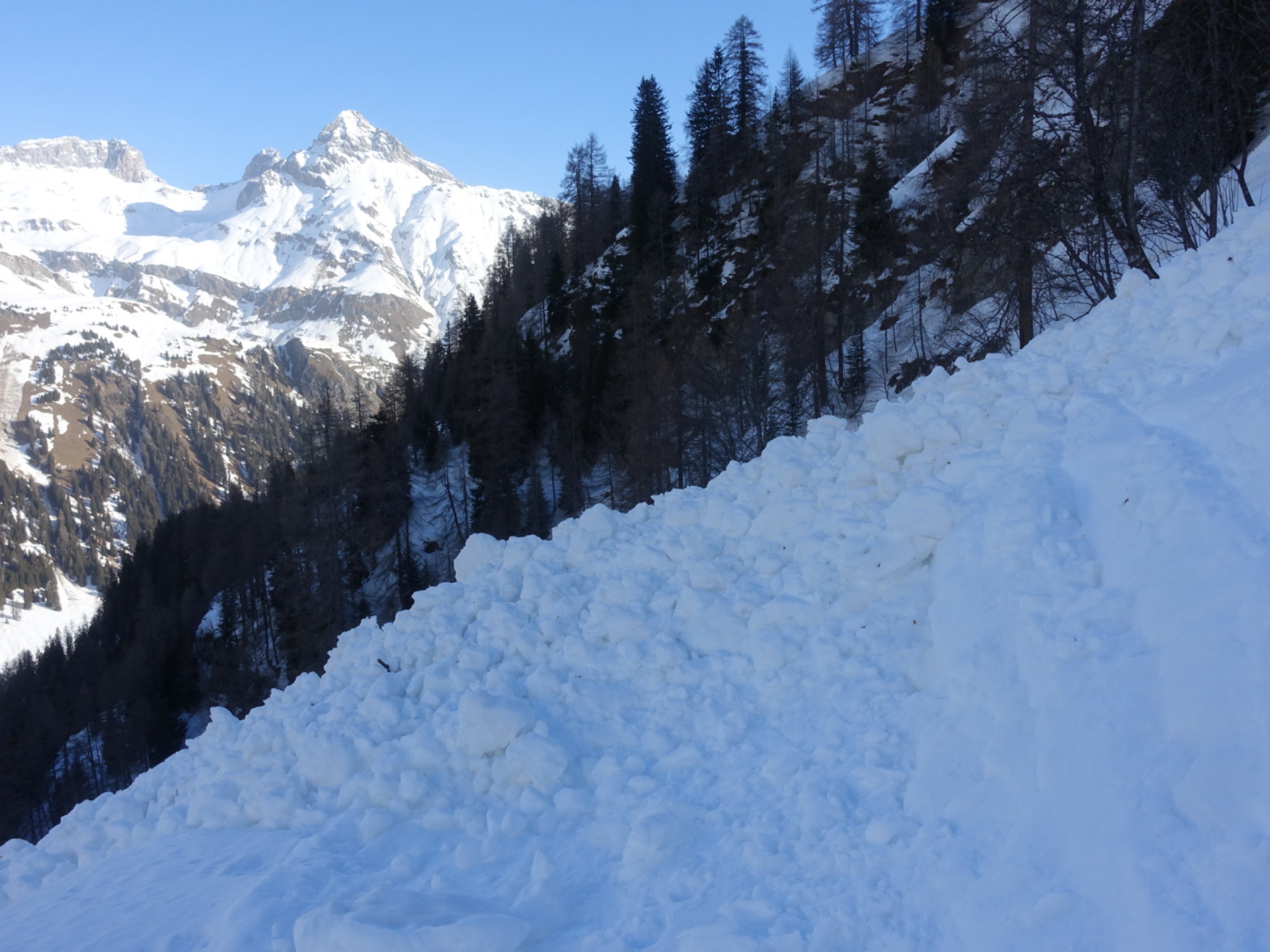Forststrasse von Splügen zur Tamboalp: Route in den Lawinenkegeln verschüttet, Schneemassen müssen gequert werden. Schneeschuhe mussten abgezogen werden. Am Morgen hart gefroren und die Querung anspruchsvoll auf etwa 500m Länge im Steilhang.Am Nachmittag heikel zwecks weiteren Lawinen im Hang. Wir sind deshalb am Nachmittag via Skipiste abgestiegen.