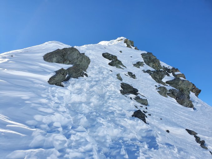 Ab Skidepot ziemlich ausgesetzt zum Piz Vadret (ging gerade noch ohne Steigeisen).