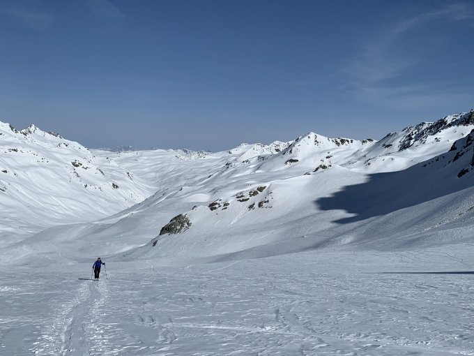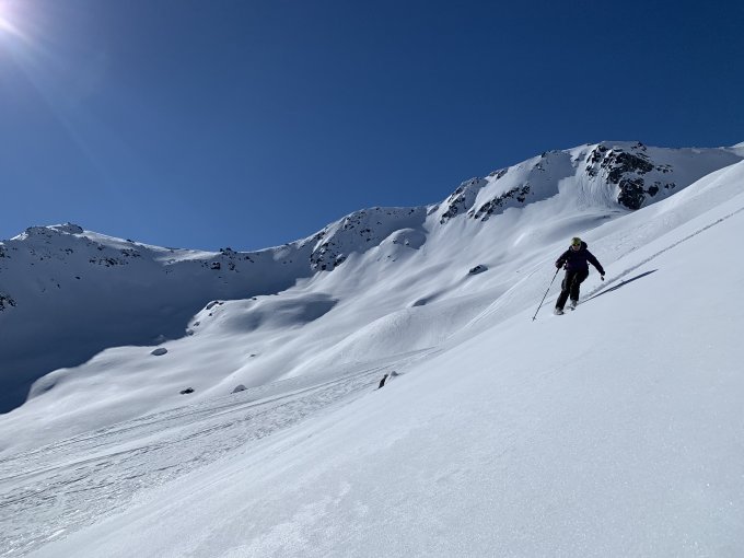 Gester hoch via Darlux-Tschimas da Tisch zur Keschhütte. Schon da kaum Pulver gefunden. Heute auf den Porchabella mit Skidepot am Sattel. Es was 09:30 und der Aufstieg hart mit sehr guten Tritten. Abfahrt via Porta D‘Es-cha um 12:00. Toller Sulz im oberen Teil. Ab Baumgrenze dann sehr Nass.