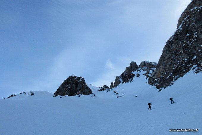 Gute Spur auf der ganzen Strecke. Alle Steilstufen sind sehr gut gespurt und haben gute, tiefe Auflageflächen drin. Wir haben trotzdem Harscheisen montiert. Das gibt mehr Sicherheit.