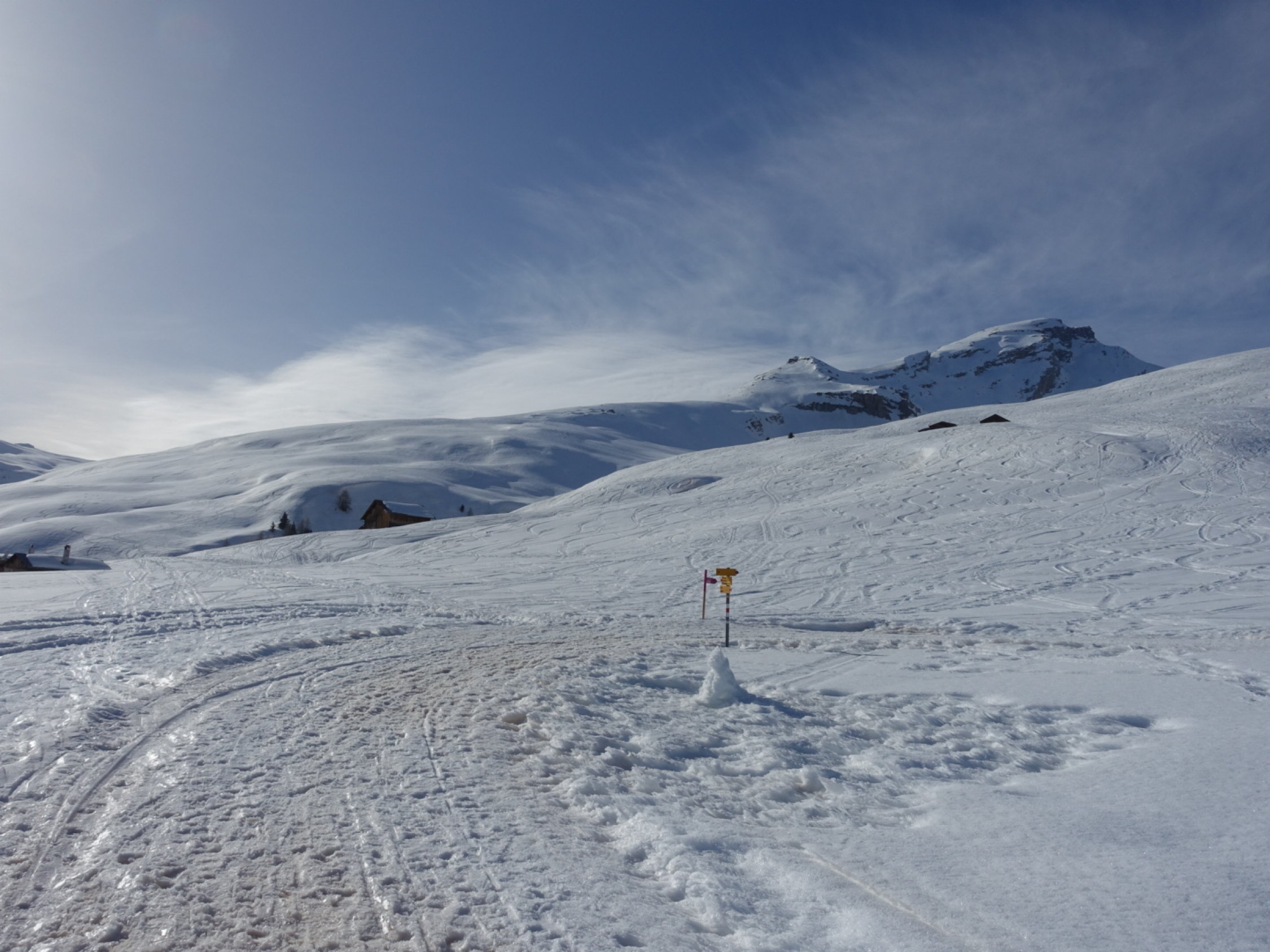 Die Steilstufe kurz unterhalb Punt Pintg mit dem vertrampelten Sulzschnee etwas "rutschig" .