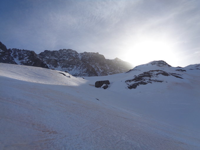 Sie bietet einen wunderschönen Blick ins Mont Blanc und auf die Südwest-Wand Couloir vom Mont Velan.