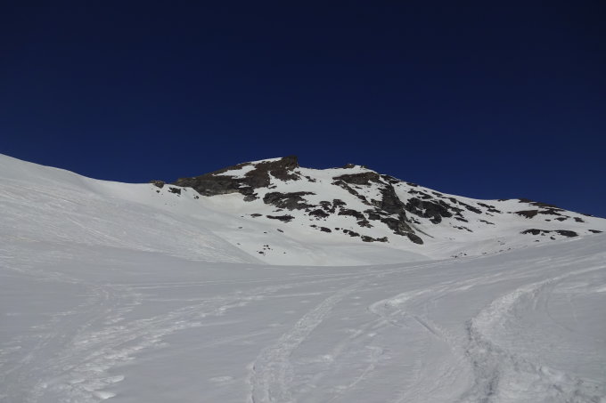 Die Waldpartie von La Gouille nach Le Louché ist mittlerweile sehr eisig; Harscheisen sind empfehlenswert. Kurz vor dem Ende des Walds ist der Schnee knapp und es lohnt sich, die Skier kurz zu tragen (man erspart sich die eine oder andere Slapstick-Einlage). Danach geht es über stark zerfahrene, aber griffige Hänge weiter. Der Gipfelaufbau des Mont de l’Etoile ist stark ausgeapert. Der Nordgrat wurde zwar gemacht, sah aber nicht sehr verlockend aus. Wir sind deshalb auf gutem Schnee bis zum Südgrat aufgestiegen. Die 100 Höhenmeter Fussaufstieg erfolgen derzeit teilweise auf aperen Wegspuren, teilweise über gut begehbare Firnfelder; Pickel und Steigeisen waren nicht nötig.