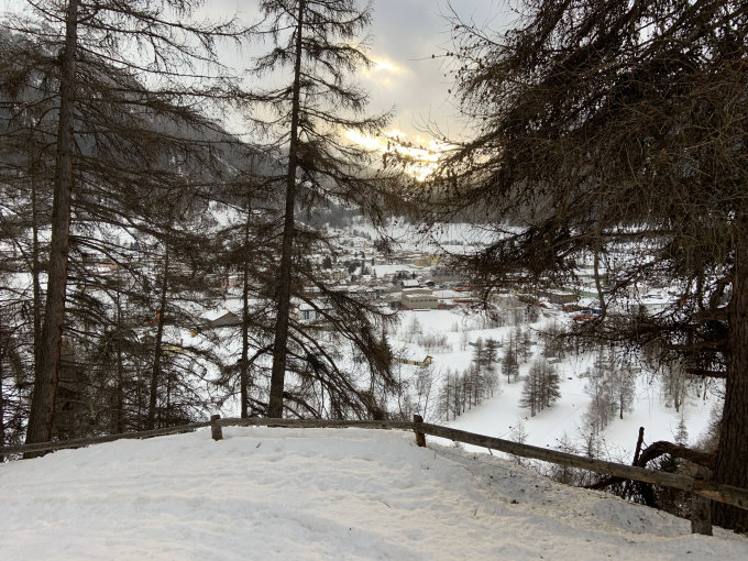 Wir wollten nach Südwesten ins Val Pülschezza abfahren. Um 11 Uhr dicker Nebel. Somit Abfahrt in gut zu fahrendem tiefen Sulzschnee nach Zernez, dann 10 Km der Strasse entlang nach Chinuos-chel