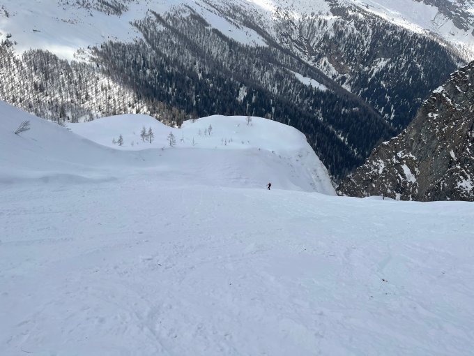 Das Couloir war in sehr guten Bedingungen: der obere Teil hat man harten Pulver Schnee angetroffen. Unten wurde der Schnee zunehmend feuchter mit einem kurzen Abschnitt Lawinen Schnee.