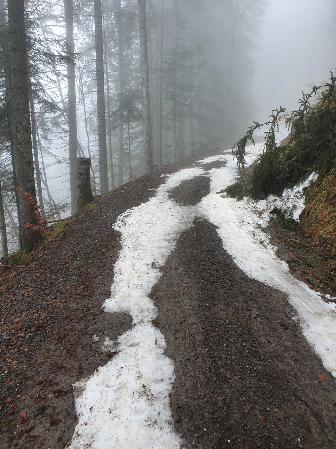 Wegen Nebel und Bise waren wir spät dran (Gipfel gegen 15 Uhr), dafür in der Abfahrt recht guten Sulzschnee angetroffen. Im Wald unten wird es bald eine kurze Tragepassage geben, sonst aber noch sehr gut eingeschneit.