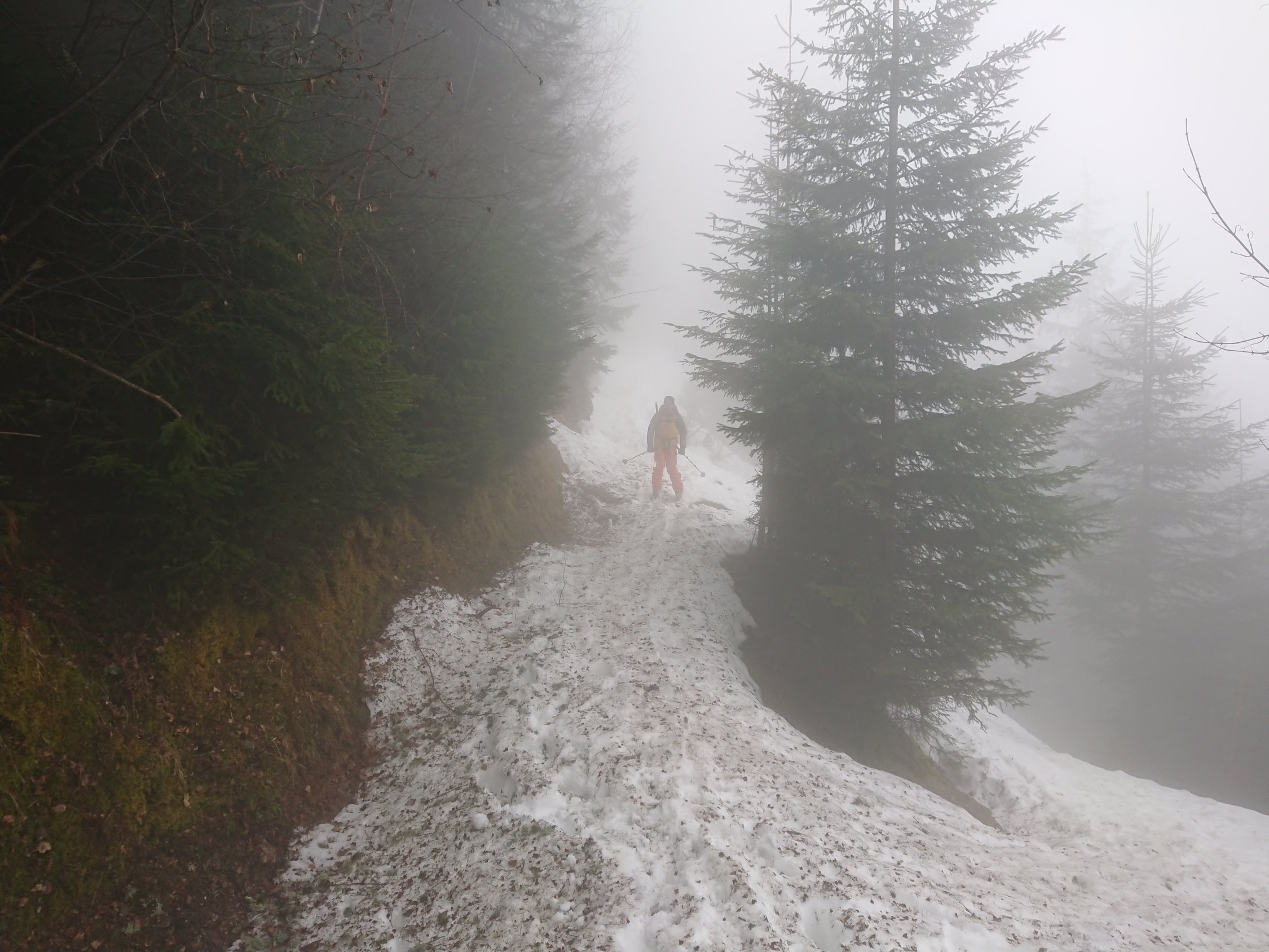 Tragpassage zwischen Breitlaui und Bristenstäfeli ca 30 min. Wird sicher mehr werden im Wald nicht mehr viel Schnee.