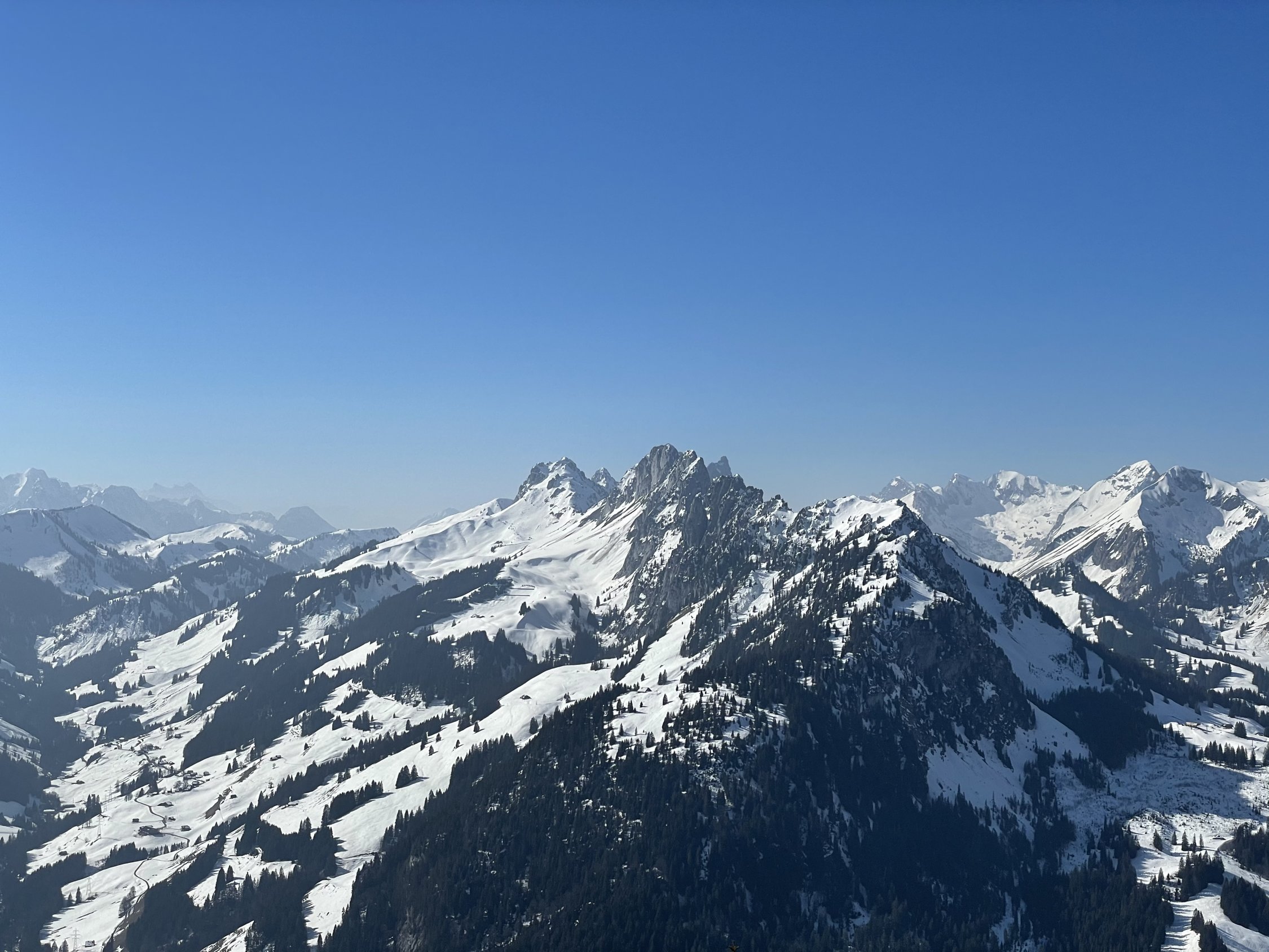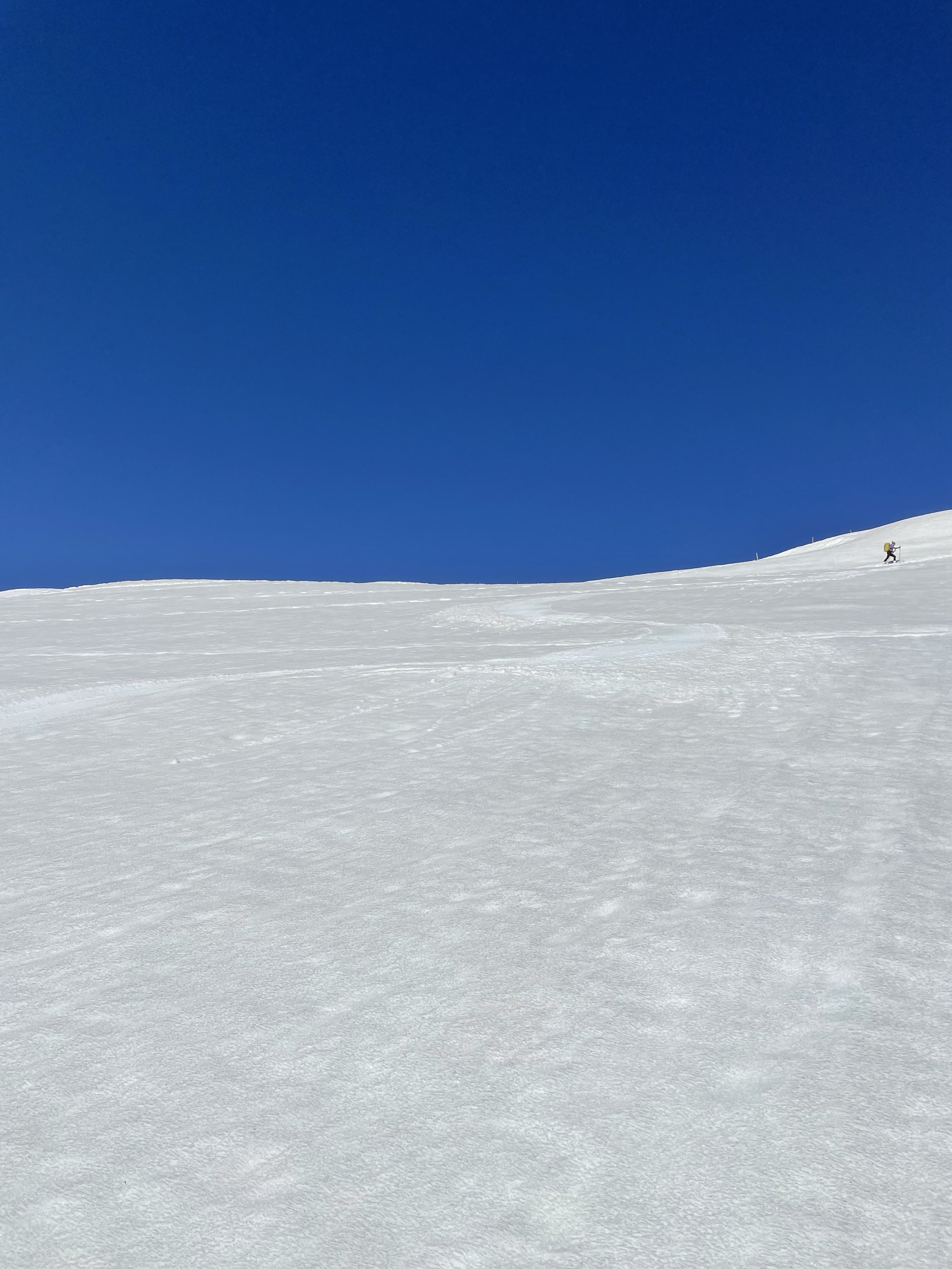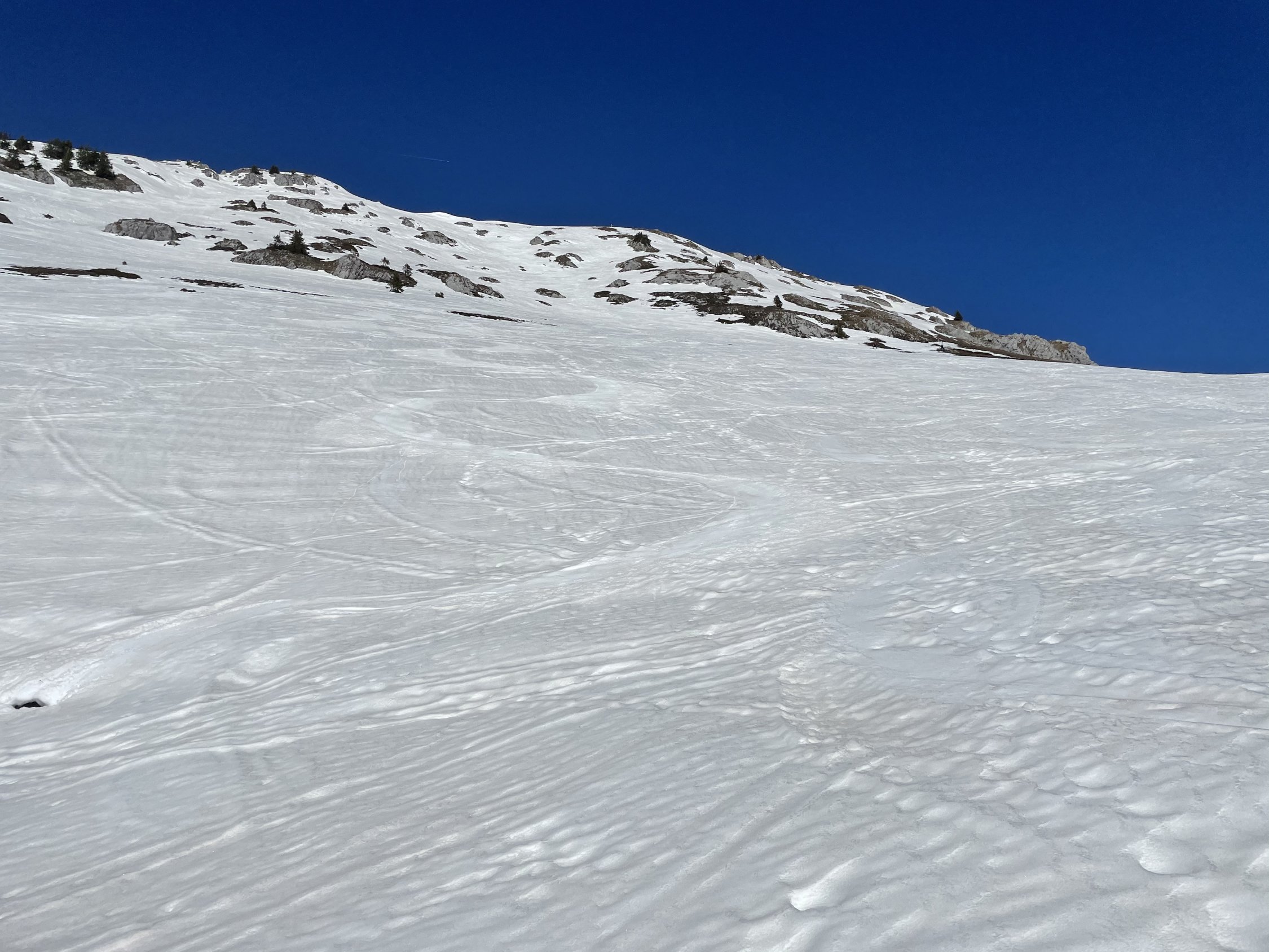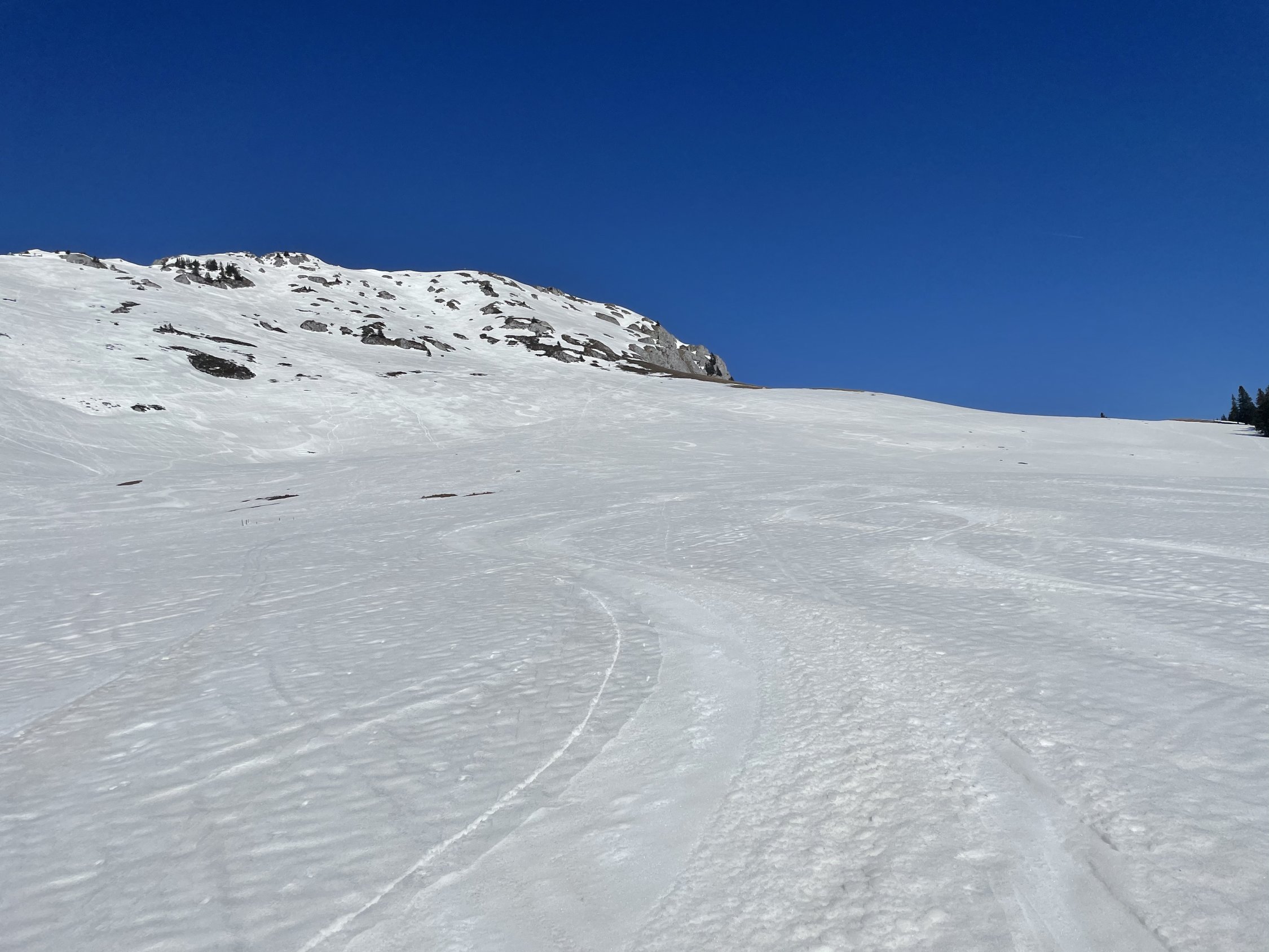 Start ab Jaunpass, brillante Verhältnisse. Im Schatten totzgefroren, an der Sonne aufgefirnt. Ich wählte nach einigem Überlegen die Route über den Sommerweg, deren Steilstück mir etwas Kopfweh bereitete. Ich weiss um meine engen technischen Grenzen... Ich entschloss mich zur Portage, und das war eine gute Idee. Vor mir aufsteigende Tourengänger hatten Stürze zu beklagen, da es im Schatten halt eisig war. Irgendwie schwindelte ich mich hoch und stieg dann auf dem schönen Grat etwas weiter. Angesichts der Wärme verzichtete ich auf den Gipfel und genoss dafür wunderschöne, steile Firnhänge in der Abfahrt. Toll bis hinunter zum Pass, wobei ein kurzer Gegenanstieg zum Kulminationspunkt des Skilifts weitere schön Hänge erschliesst.