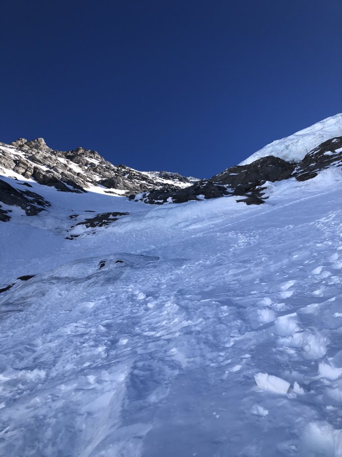 Unterhalb des Eisabbruchs super Trittschnee. Gut griffig und prima zum abfahren. Ab ca 13 h erreichen Sonnenstrahlen den Eisabbruch.