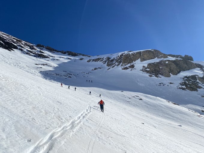 Abstieg bis zum Skidepot und dann eine traumhafte Abfahrt über steile Sulzschneehänge. Frühlingsskifahren vom Feinsten.