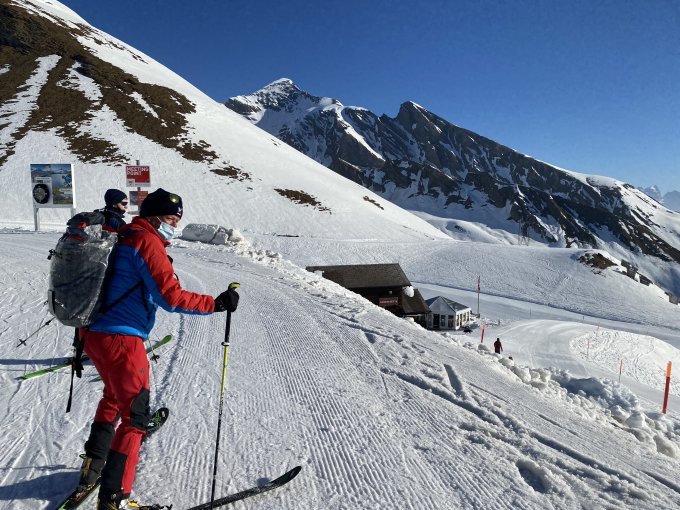 Abfahrt bis Schilt, Aufkleben der Steigfelle und Aufstieg durch den steilen Kessel. Richtungsänderungen nur mit Spitzkehren möglich. Als der Schnee härter wurde, haben wir die Harscheisen montiert. Sehr steiler aber zügiger Aufstieg bis zur Schulter, wo wir die Ski deponierten, da auf dem Gipfelgrat zu wenig Schnee lag.