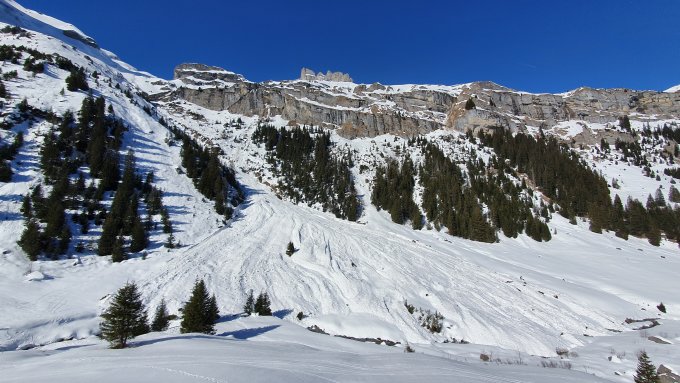 Grosser Lawinenkegel vom Chantbach ins Soustal (gut 200m breit, siehe Bild). Die mehrheitlich bevorzugte Abfahrtsspur führt deshalb rechtshaltend vom Bach entlang Sousläger.