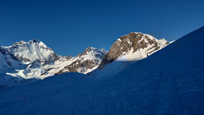 Aufstieg: Start um 07:15 bei +2°C. Entspannter Aufstieg über den planierten Weg bis zur Skihütte. Danach in teils sportlicher aber meist griffiger Spur hinauf zum Teehüttli und weiter zum Abzweig auf 2.400m. Einzelne Stellen sind rutschig, aber es geht ohne Harscheisen. Auch die folgende Querung geht dank guter Spur problemlos. Nach Erreichen des Sattels hinter P.2515m werden die Ski für 50 Distanzmeter aufgebunden, anschließend geht es auf Ski weiter. Für die folgende ansteigende Querung sind Harscheisen sehr zu empfehlen. Nach der Rechtskurve recht einfach bis zum Skidepot. Von dort in guten Tritten zum Gipfel. Die Schlüsselstelle war aufgrund vereister Felsen der Ausstieg aus dem kleinen Kamin. Ankunft am Gipfel gegen 11:15.