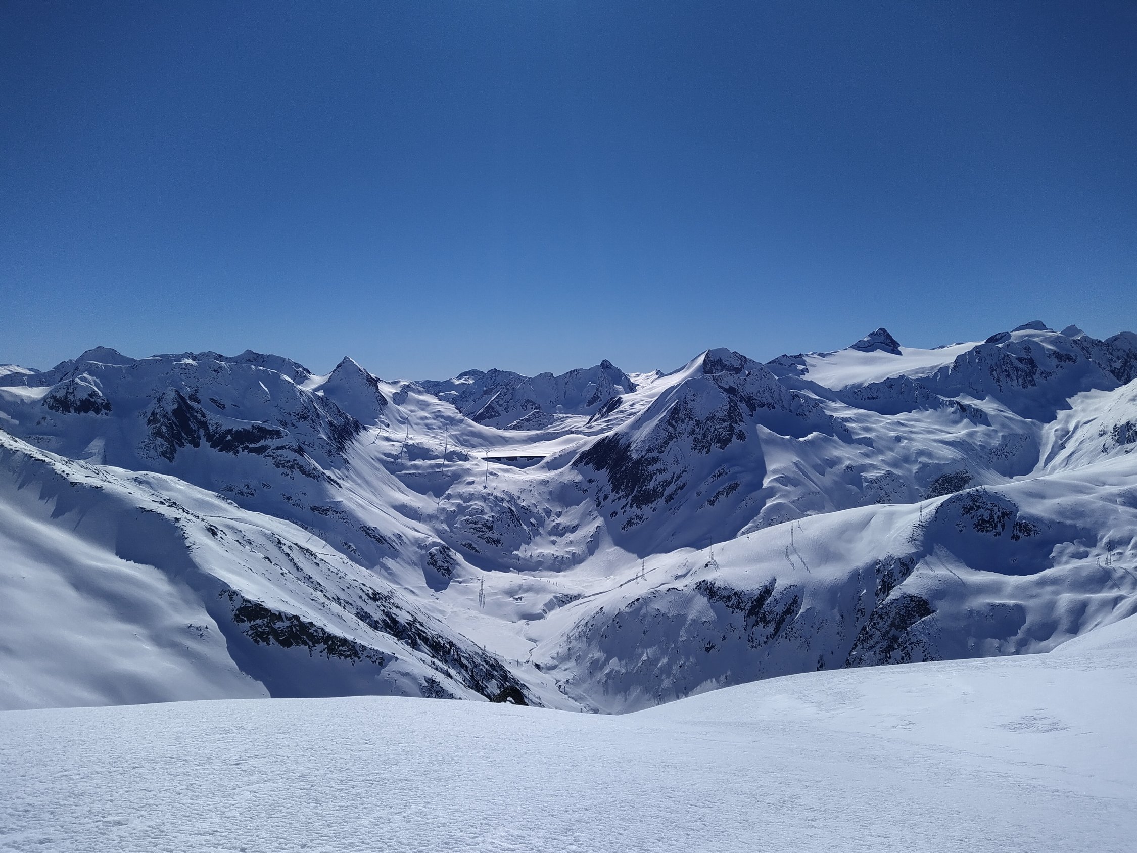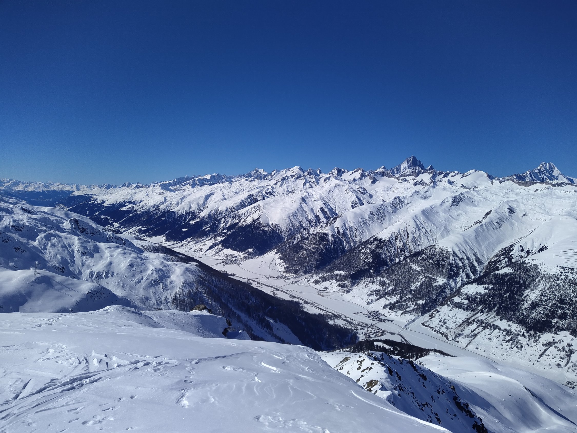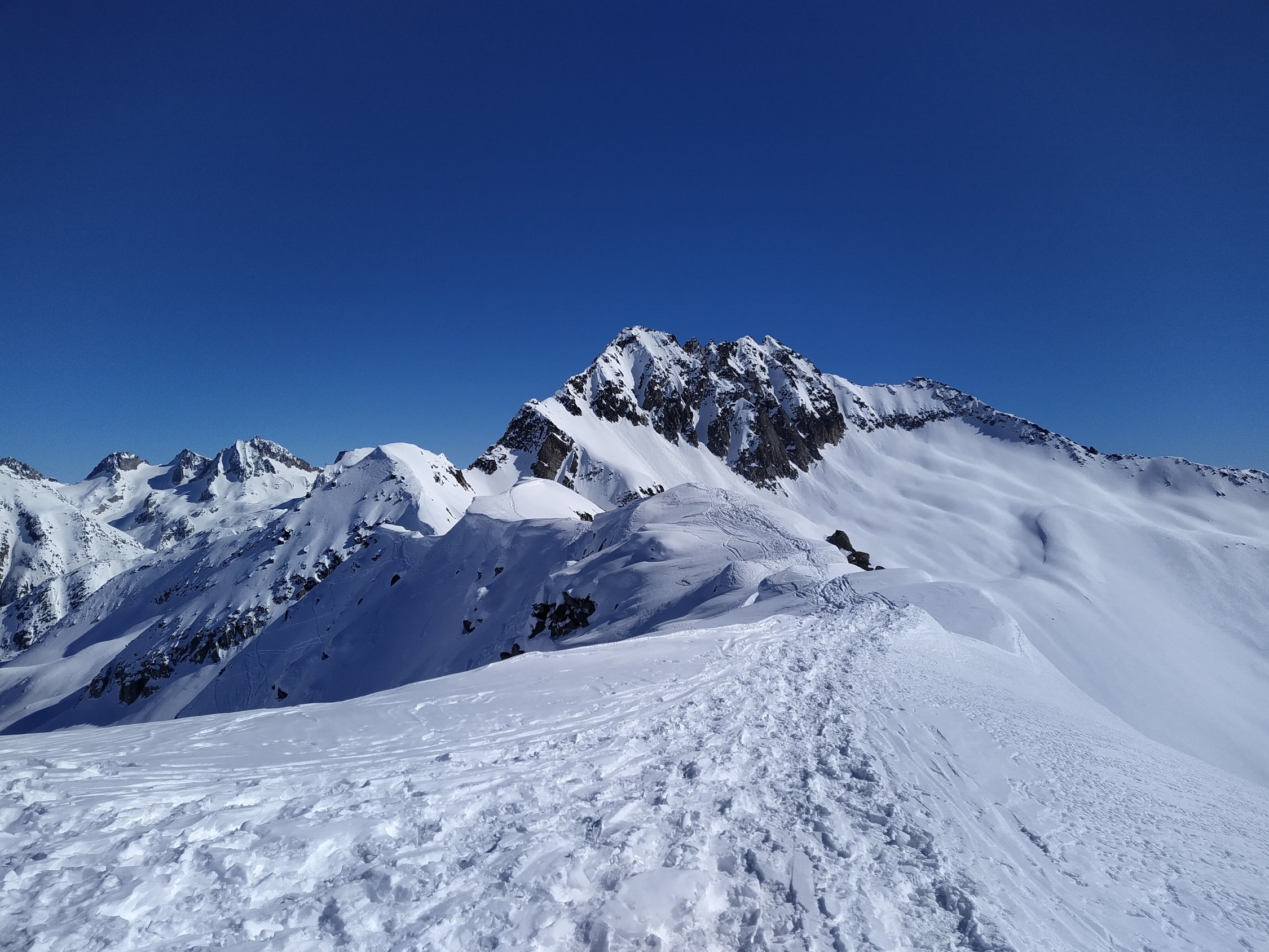 Aufstieg ab Ulrichen bis oberhalb Mällige fast durchgehend hart (unten gefroren, oben oft windgepresst). Harscheisen waren sehr dienlich. Danach recht angenehm bis zur Gipfelflanke. Es ist eine formidable Spur duch die Steilflanke direkt vom Sattel unter dem P.2665 bis zum Gipfelgrat gelegt. (Vermutlich) Ausgeschaufelte Terrassen für die Spitzkehren! Der sanfte Gipfelgrat ist gut gangbar, wahlweise auf Fuss- oder Skispur. Tolle Aussicht Richtung Griess und ins Goms bei leichtem Wind.